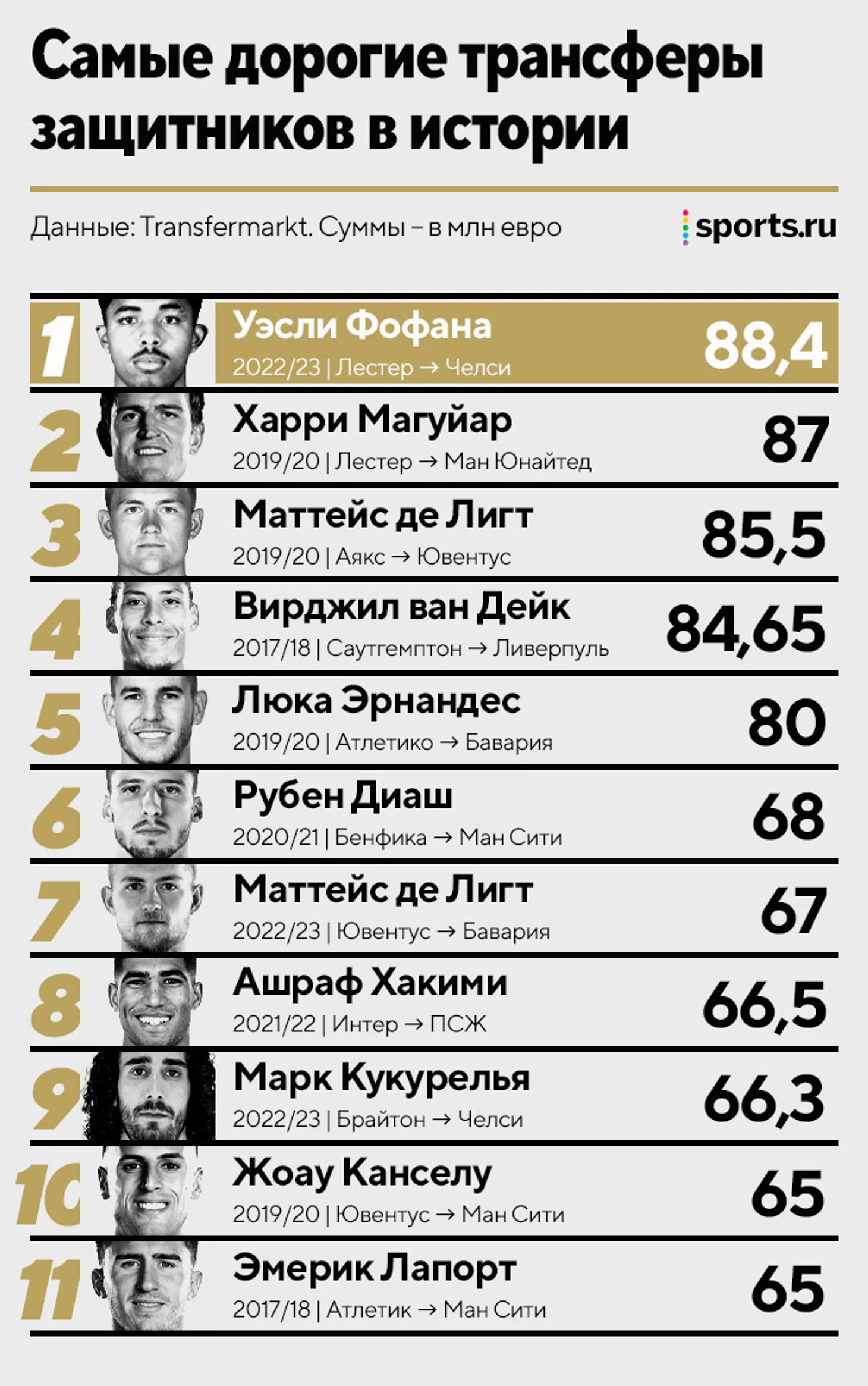 В евро за Фофана отдают 88,4 млн – это рекорд среди трансферов защитников. А вот как выглядит весь топ.