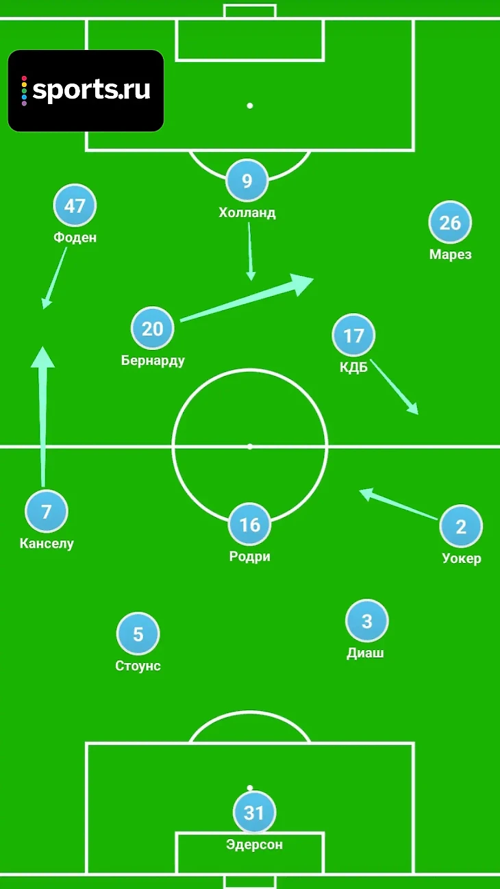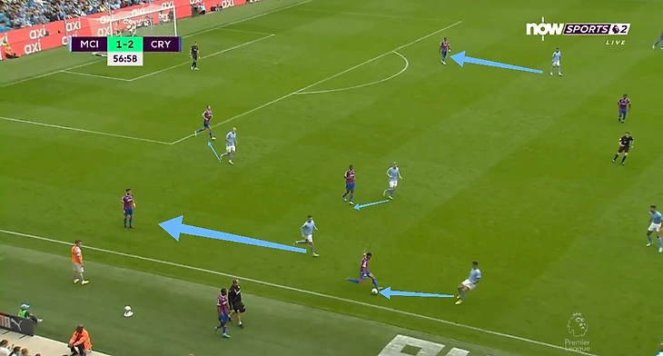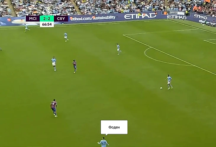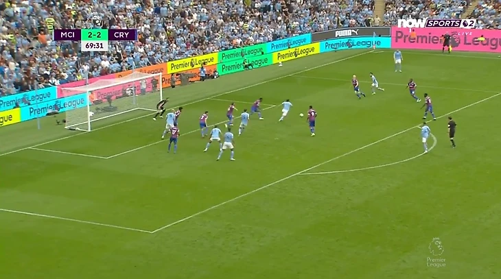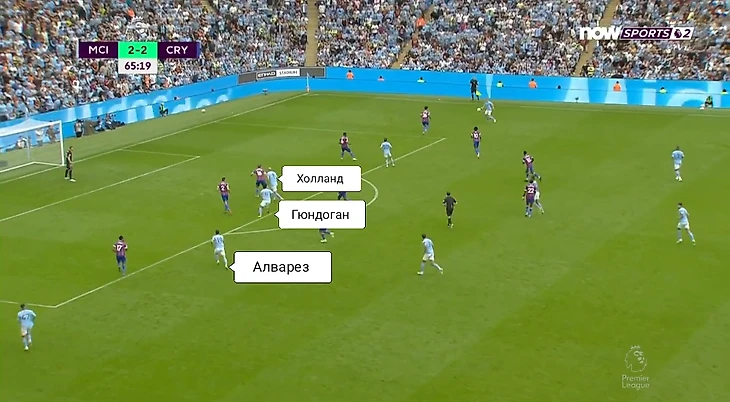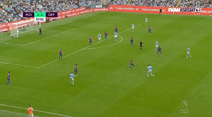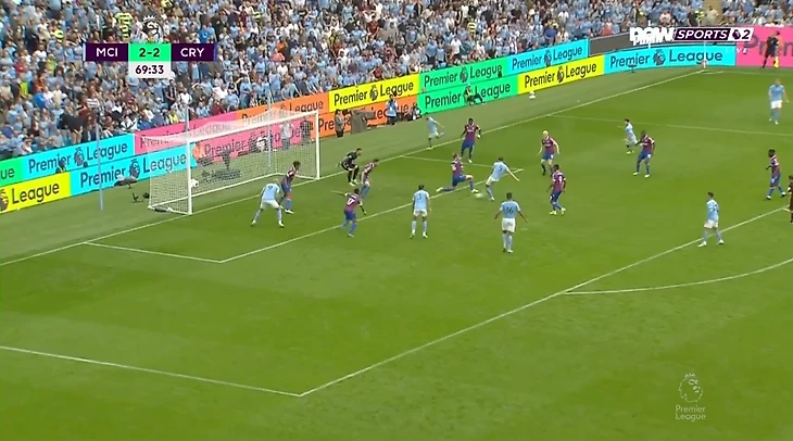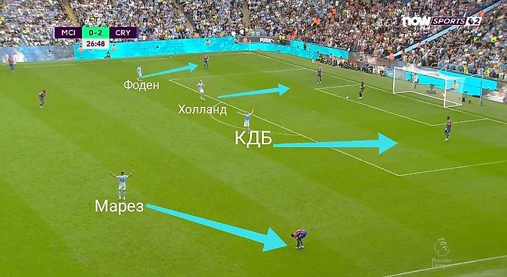 КДБ оң жақ қаптал арқылы Кристал Пэластың айып алаңына желдете пас береді, ол пасты Фил Фоден қабылдап, Эрлинг Холландтың басына пас береді, осылайша есеп 2-2 болып өзгереді. Ойыншылар схемада көрсетілген рөлдерін жақсы атқарды.