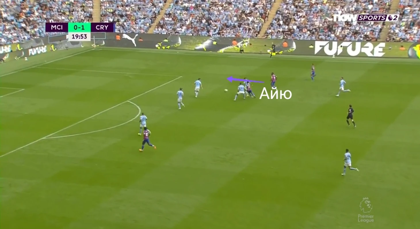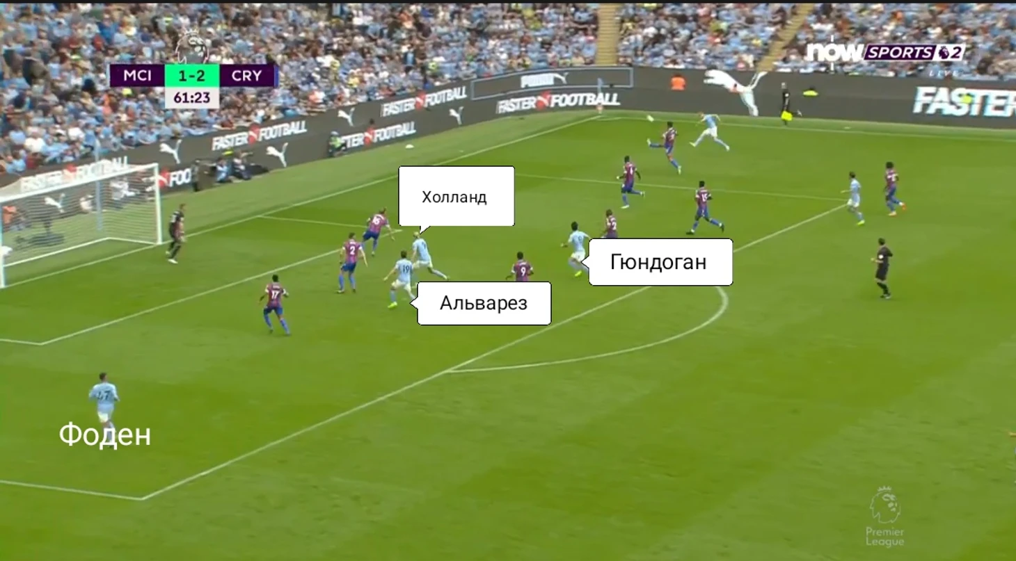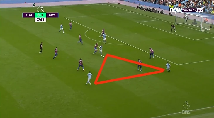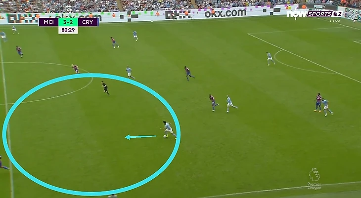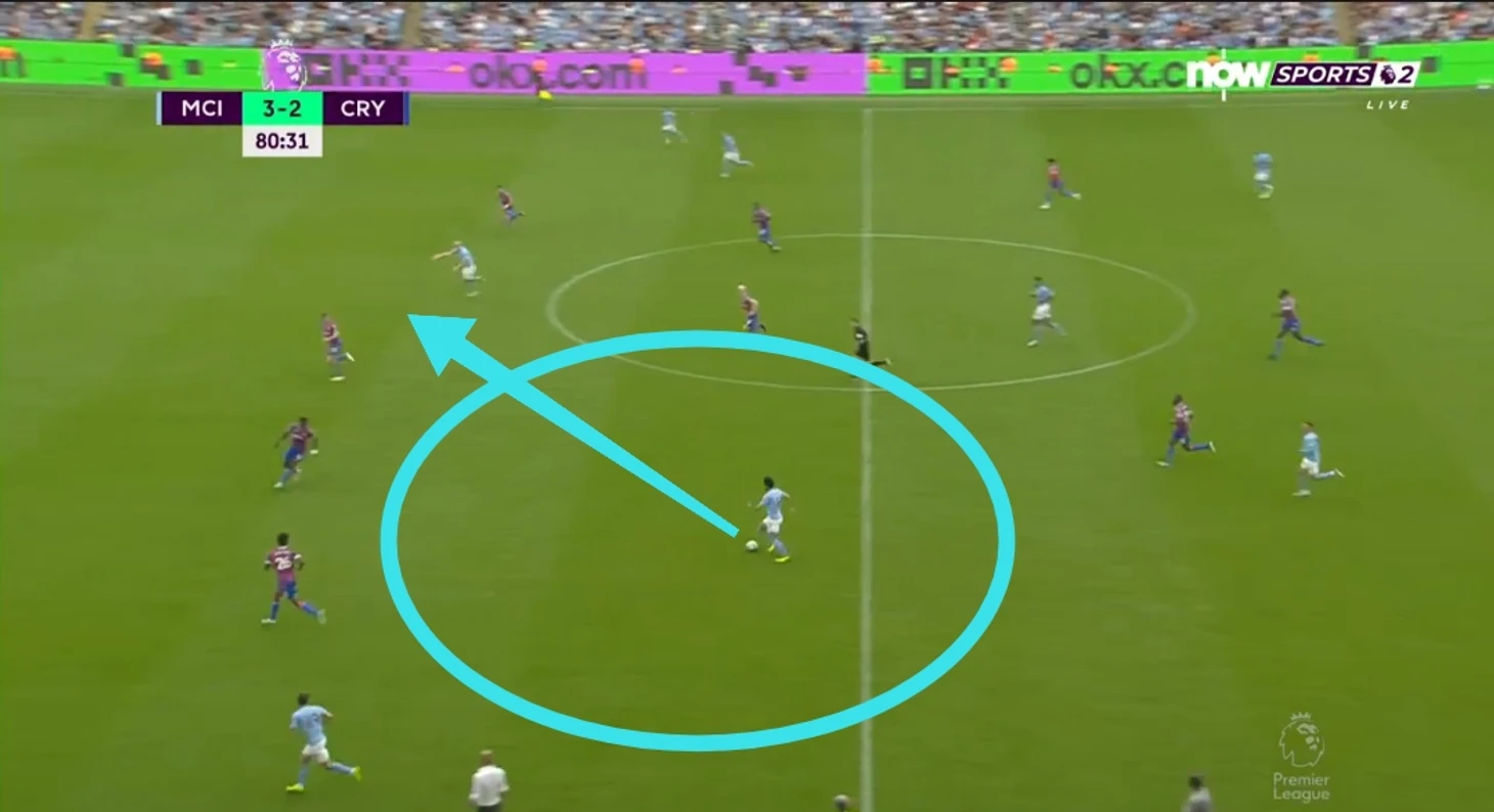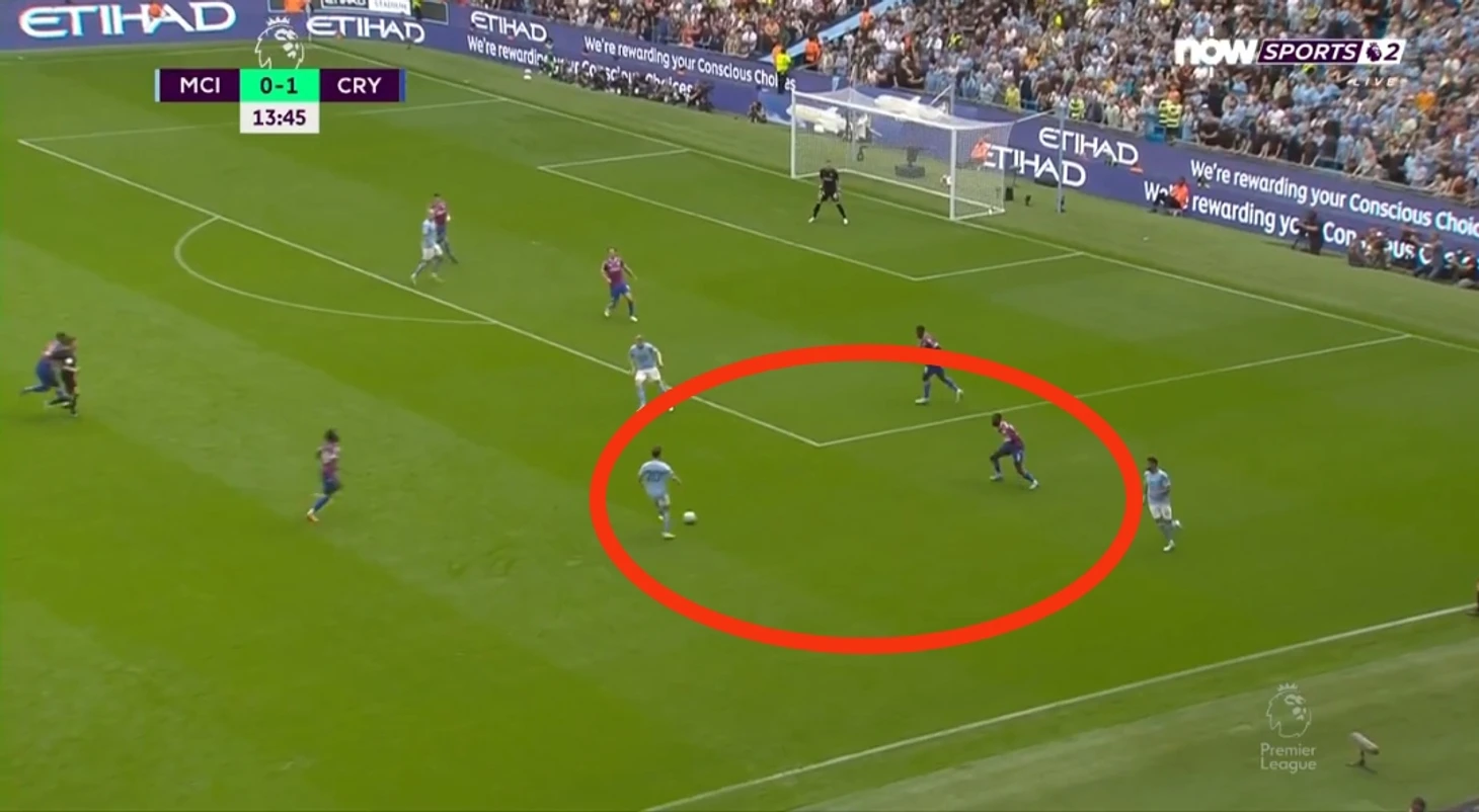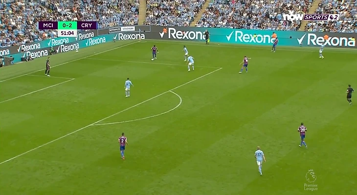 Допты қарсыластардан тартып алған соң, Илкай Гюндоган өте үлкен ашық аймақта қалып қалады, осы мүмкіндікіті жақсы қолданып Эрлинг Холландқа пас шығарып береді. Бұл шабуылда Кристал Пэлас командасының артқы жартылай қорғаушыларын кінәлі деп санасақ болады, себебі Илкай Гюндоганға өте үлкен ашық аймақ беріліп қойды.