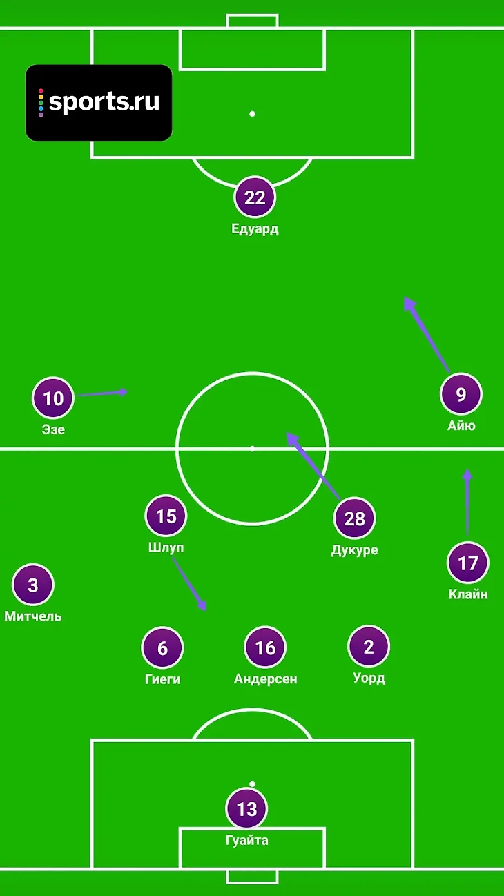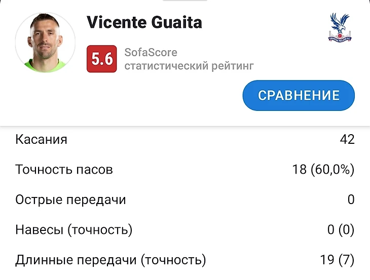 Кристал Пэлас қақпашысы Висенте Гуайта осы матчта 19 ұзын пас (длинные передачи) берді, яғни бұл Патрик Виейра шәкірттері билд-ап арқылы ойнаудан бас тартты деп айтсақ болады.