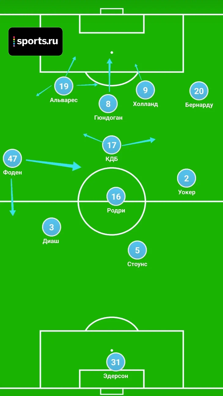 Манчестер Сити құрамында ойыншылардың рөлі: 1. Пеп Гвардиола алдыңғы ойындарға қарағанда 1 ақ ойыншыны ауыстырды, ол Рияд Марез Илкай Гюндоганның орнына. Бернарду Силва оң жақ шабуылшы қызметін атқарса, бұл матча Рияд Марез болғандықтан оң жақ жартылай қорғаушы болды. 2. Кайл Уокер Манчестер Ситидің соңғы 2 маусымында болған қызметін атқарды, яғни Родриго Эрнандеске орталық артқы жартылай қорғаушы ретінде көмек көрсетіп, орталық аймақта басымдықты ұстады. 3. Эрлинг Холланд Пеп Гвардиоланың системасына үйренуде, соңғы матчтарға қарасақ, ол "жалған тоғыздық" рөлін атқарды, осы матчта сол рөлімен ойнады.