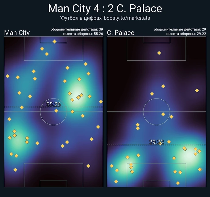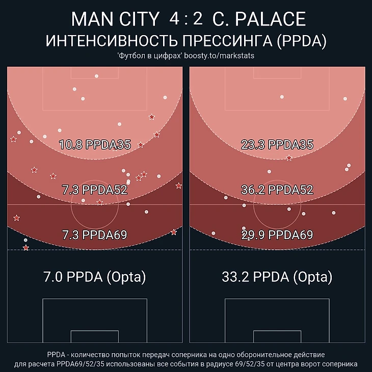 Манчестер Сити: 2-ші тайм басталысымен өте қатты қысым көрсетті. PPDA (Opta) статистикасына сүйенетін болсақ, Манчестер Сити Кристал Пэлас командасына орта есеппен әр 7.0 пас сайын допты өз қолдарына алып отырған. Статистикада көрсетілген бесжұлдзды пішіндер, допты тартып алынған зоналарды көрсетіп тұрады.