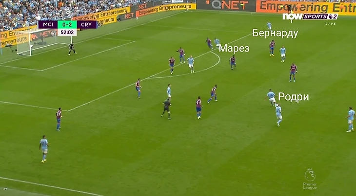 Қалалықтардың бірінші ГОЛы: Пеп Гвардиола автобус қоятын командаларға қарсы ойынын, осы ГОЛ арқылы жақсы түсінуге болады. КДБ екінші таймда "еркін суретші" (свободный художник) рөлін атқарды, яғни шабуыл жасағанда кез келген жерде жүріп командасына көмек береді. Осы шабуыл кезінде КДБ сол жақ қапталға келіп допты қабылдап алады, онымен қатар Кристал Пэлас командасының төмен қорғаныс блогыда солға қарай жылжиды, КДБ допты қабылдап Родриге береді. Родри оң жақ қапталда жалғыз тұрған Бернардуға пас береді, Бернарду неге жалғыз тұр деген сұраққа келетін болсақ, Рияд Марез Кристал Пэлас қорғаушысы Митчельді өзімен алып кетіп Бернардуға еркін аймақ қалдырады, допты өзіне алған Бернарду Арьен Роббен футболшысының тәсілі арқылы оң жақ қаптал арқылы ортаңғы аймаққа кіріп соққы жасап ГОЛ салады. Бұл шабуылда Кристал Пэлас ойыншысы Эбиричи Эзеге айып тақсақ болады, себебі ол Бернарду жалғыз қалғанын байқамады, қорғанысқа қайтып үлгерседе жеткіліксіз болды.