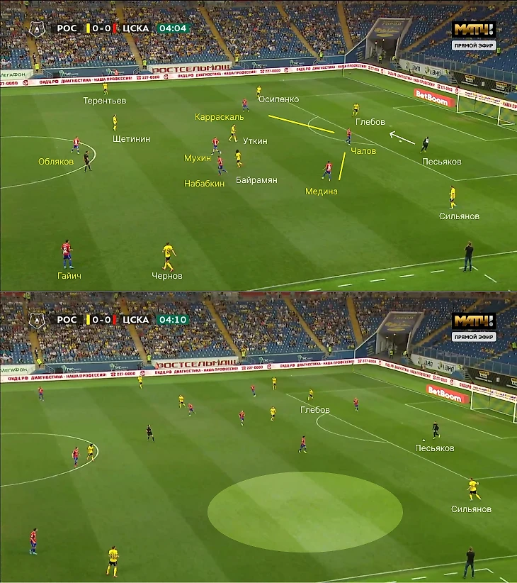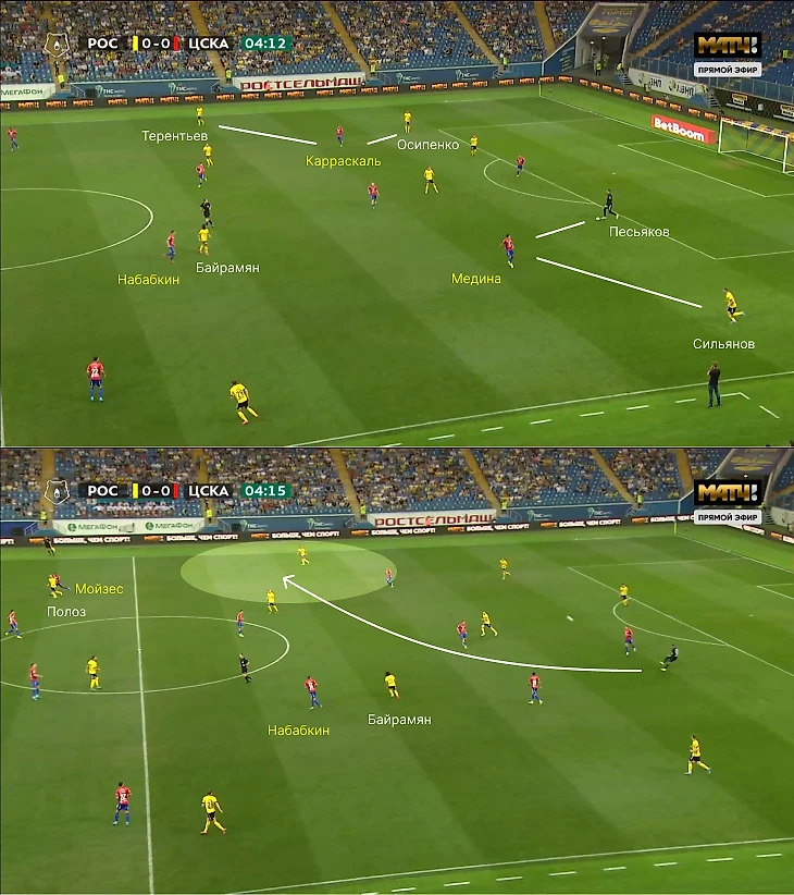 В итоге движение заставило Медину выбирать: прессинговать Песьякова или обозначить давление на Сильянова. В итоге Хесус застыл между вратарем и защитником. Похожая ситуация возникла и на противоположном фланге – Карраскаль был в полупозиции рядом с Терентьевым и Осипенко. Бонус – позиция Полоза, которая увела Мойзеса глубже и освободила фланг для правого защитника.