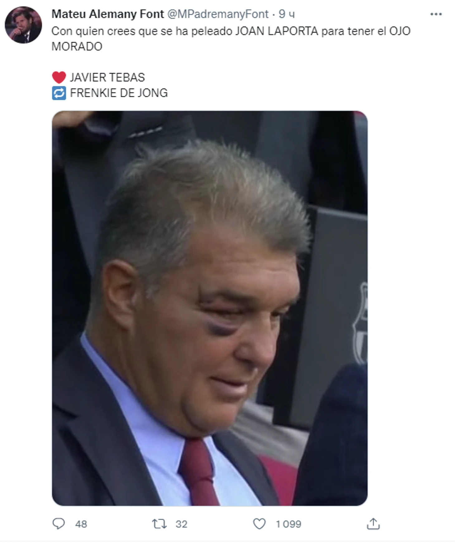 - Как вы думаете, кто поставил Лапорте синяк под глазом: Хавьером Тебас или Френки де Йонг? (@MPadremanyFont)