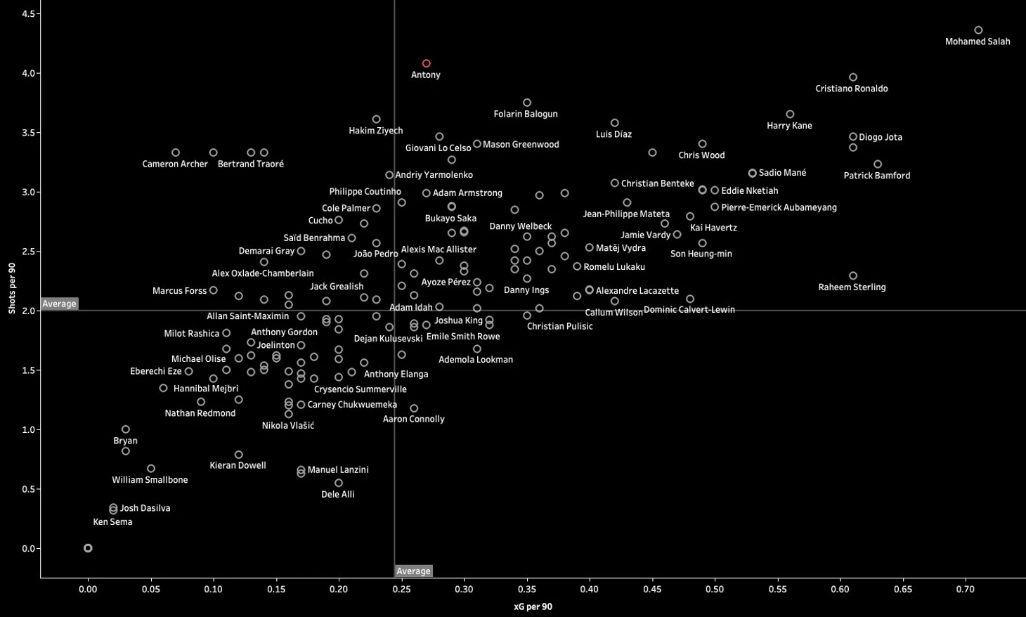 Энтони также делает очень большое количество ударов за 90 минут, больше, чем большинство форвардов премьер-лиги. Его средняя дистанция выстрела составляет 16 метров, что является средним показателем по сравнению с другими. Это указывает на то, что он мог бы стать хорошим средством для забивания голов в Манчестер Юнайтед, который нуждался в голах в предыдущем сезоне.