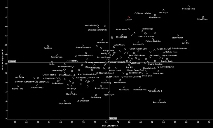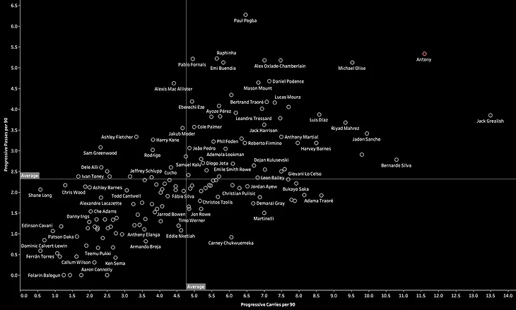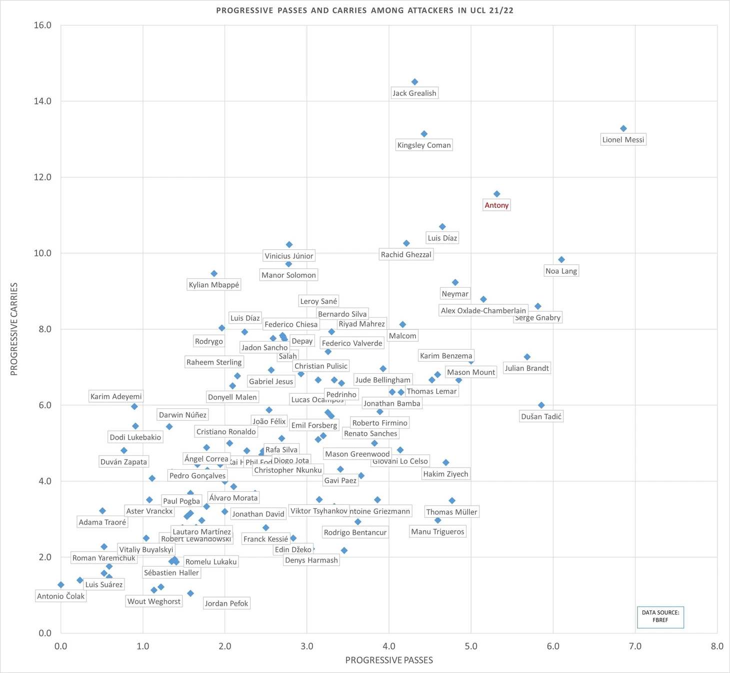 Энтони является первоклассным игроком в управлении мячом, и что выделяется, так это его всесторонняя способность развивать игру с помощью пасов и проходов. Он, возможно, более совершенен в этих областях, чем любой нападающий/вингер АПЛ, что принесло бы огромную пользу «Юнайтед». Особенно хорош бразилец при кроссах в штрафную площадь. Мало того, что он выполняет много кроссов, так при этом их исполнение на высоком уровне.