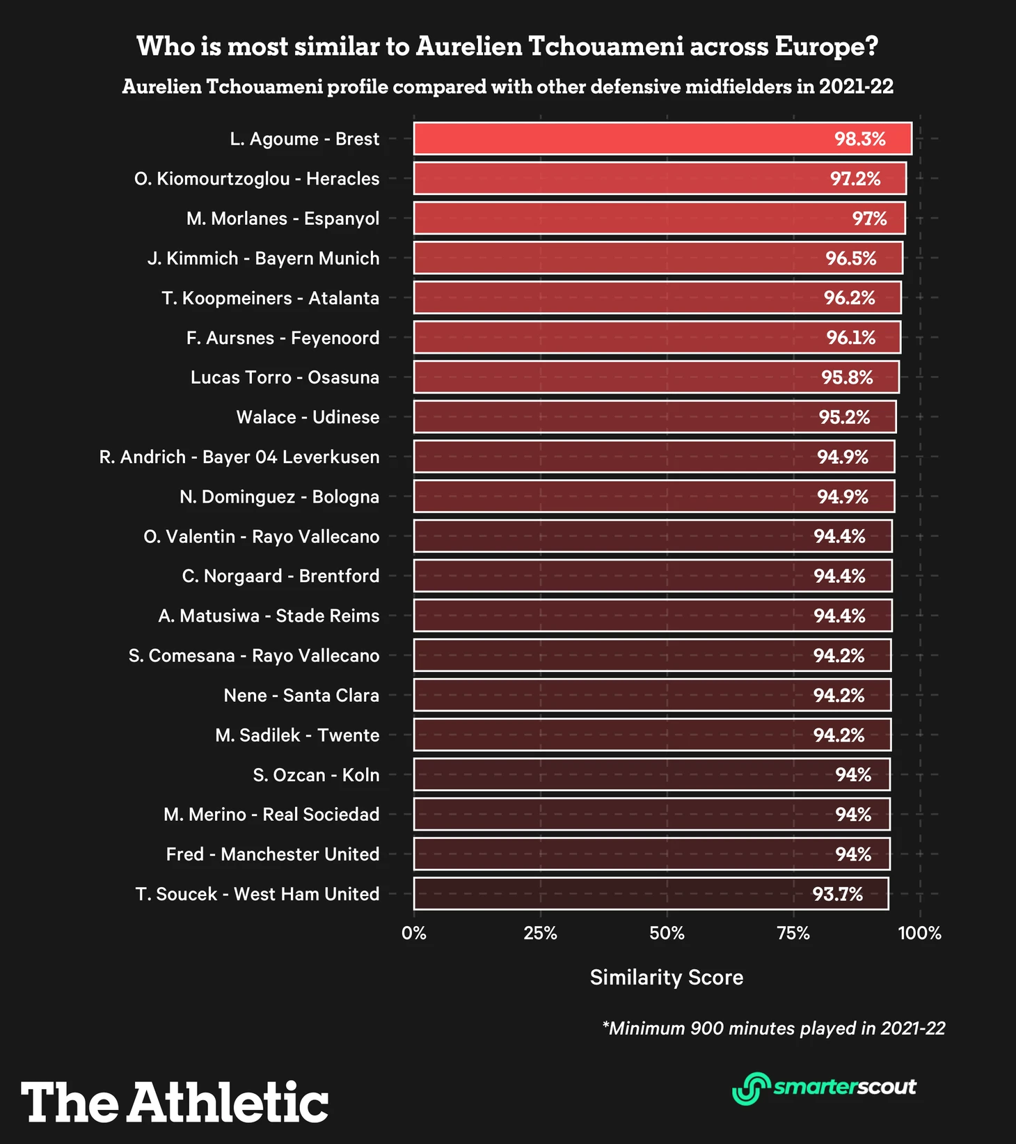 Используя показатели smarterscout мы провели тест данных, чтобы найти игроков по всей Европе, которые оценивались так же, как молодой француз, по таким показателям, как объем связующей игры, продвижение мяча, прогрессивная передача и удержание мяча.