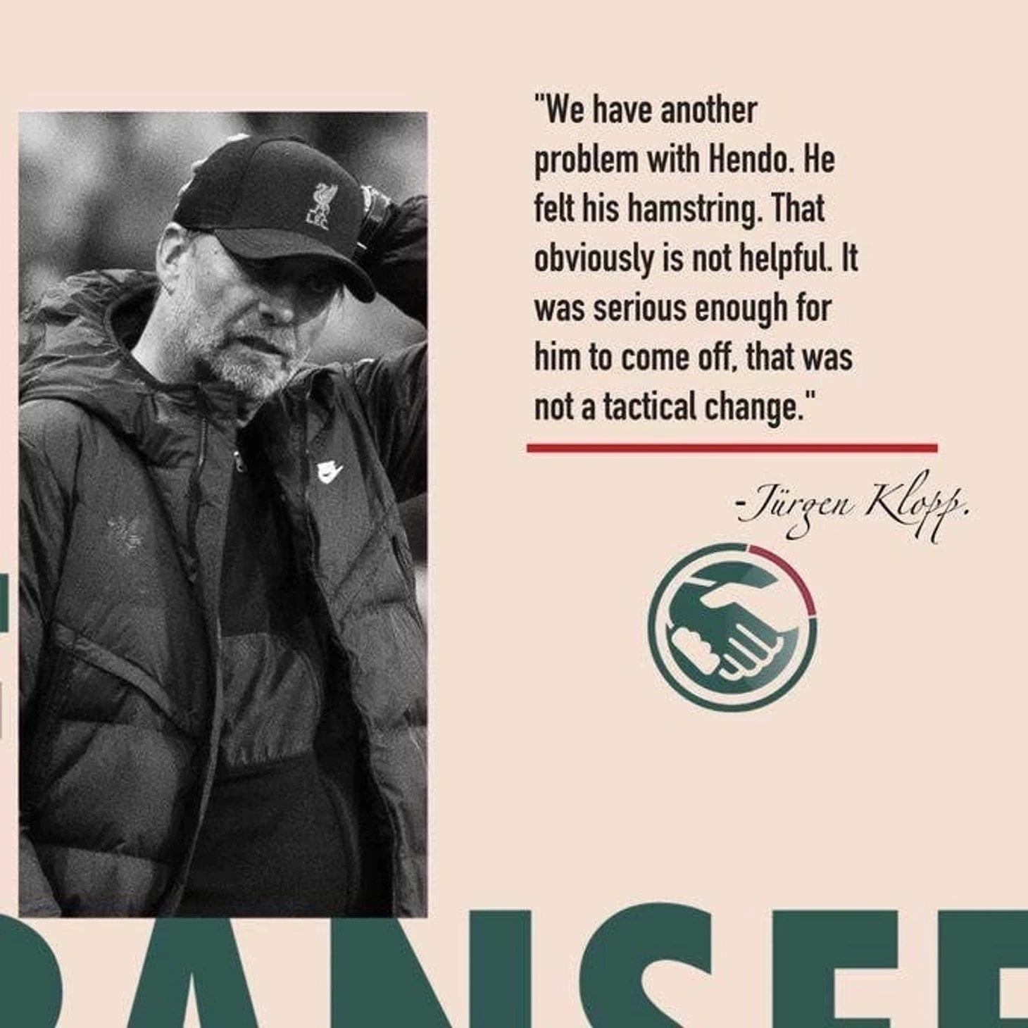 «У нас очередная проблема с Хендо. Он почувствовал мышцу задней поверхности. Очевидно, это не помогает. Повреждение достаточно серьёзное, чтобы понадобилась замена, это не было тактическим решением».