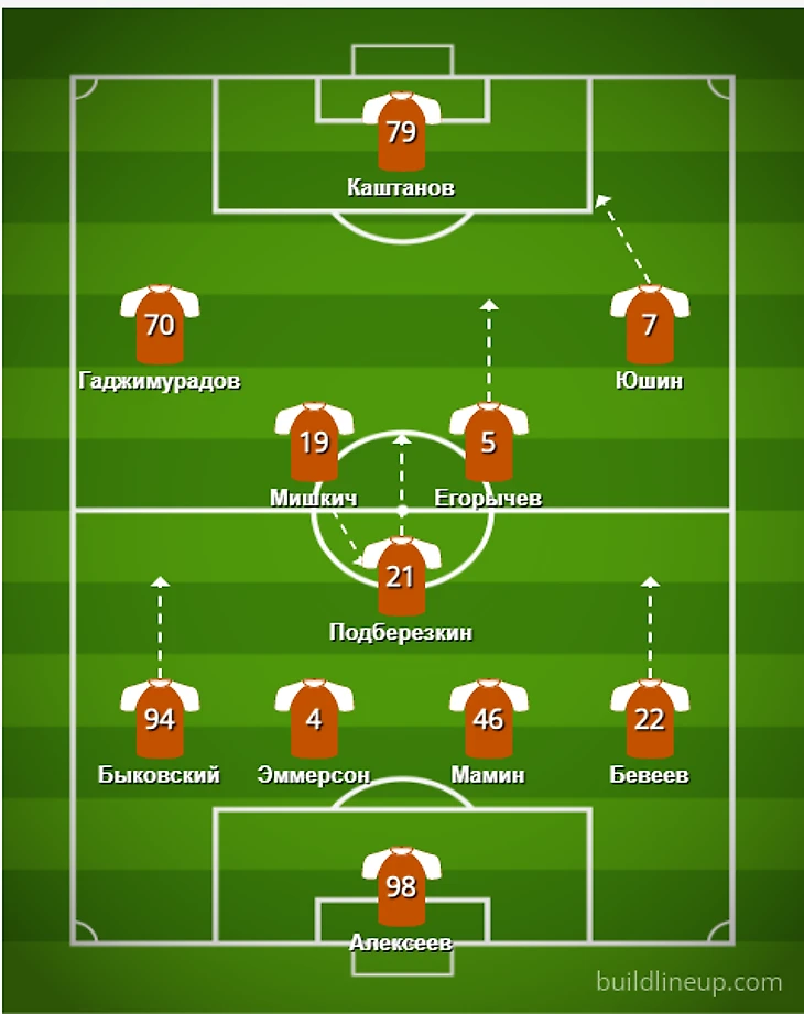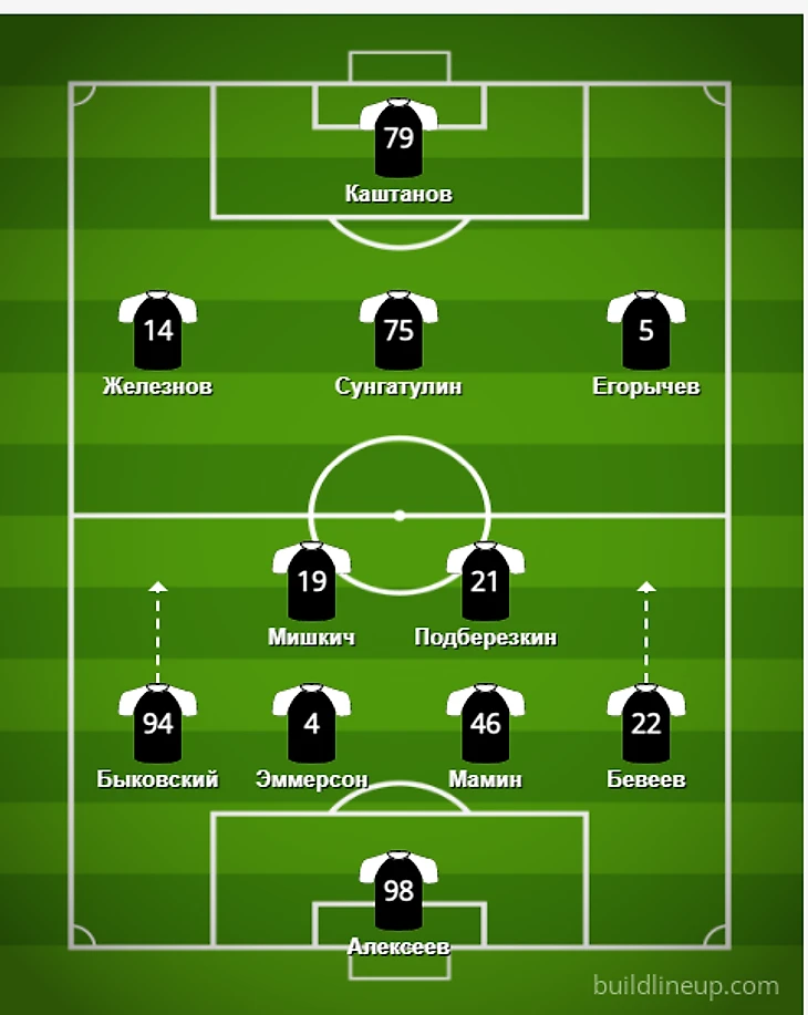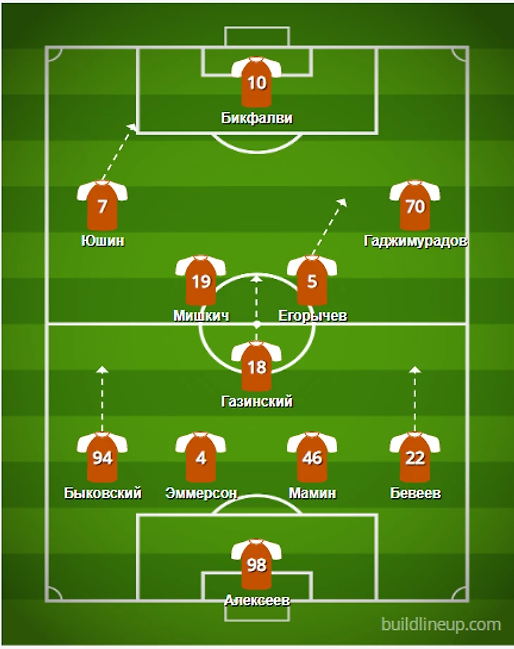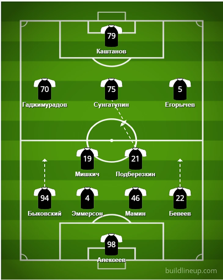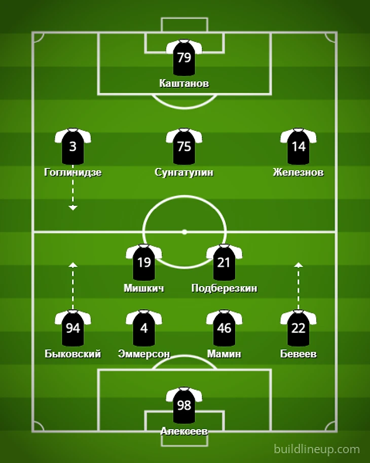 4-3-3. Строенный центр, инсайды активно поддерживают нападающего (Эрика). Центральные защитники - Эммерсон и Мамин (вместо Кузьмичева и Герасимова). Молодые Бевеев и Быковский по краям обороны с постоянным подключением.