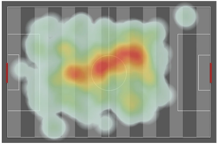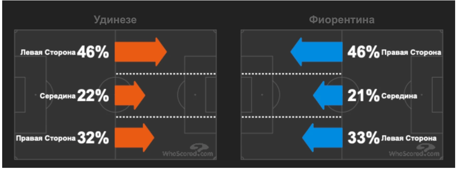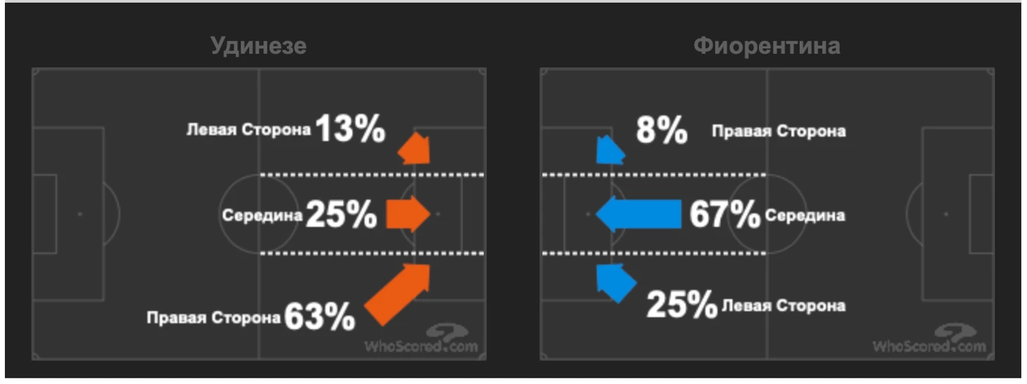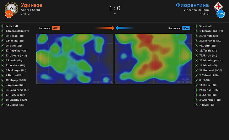 Отчетливо виден окрас игры Фиорентины через тепловые зоны. Стараясь растянуть соперника, полузащита переводит мяч с фланга на фланг, но в основном на этом все и заканчивается.