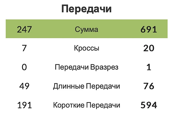 В сухом остатке получается так, что фиалки тотально доминируют по владению мяча, не понимая, что с ним делать. Они совершают немыслимое количество касаний и передач с высоким процентом по точности, но из них львиная доля приходится на короткий перепас.