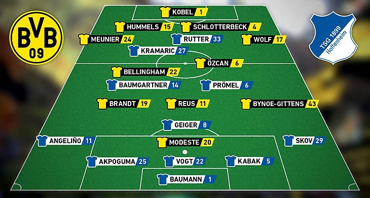 По сравнению с предыдущей игрой с «Гертой» в Берлине, главному тренеру «Боруссии» Эдину Терзичу пришлось обойтись без Рафаэля Геррейро и Карима Адейеми. Кроме них в матче не смогли принять участие Махмуд Дауд и Дониэлл Мален. Из-за отсутствия португальца со своего правого фланга на левый перешел универсал Мариус Вольф, а на правый вернулся Томас Менье. Юлиан Брандт на этот раз начал матч в полузащите справа, но при этом он, как и в Берлине, очень много двигался, и очень часто формировал двойную «десятку» с Ройсом. В остальном состав был вполне ожидаем: Грегор Кобель, Нико Шлоттербек, Матс Хуммельс, Томаc Менье, Салих Озджан, Марко Ройс, Юлиан Брандт, Джуд Беллингем, Мариус Вольф, Джейми Байно-Гиттенс и Антони Модест.