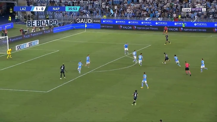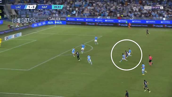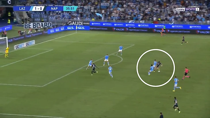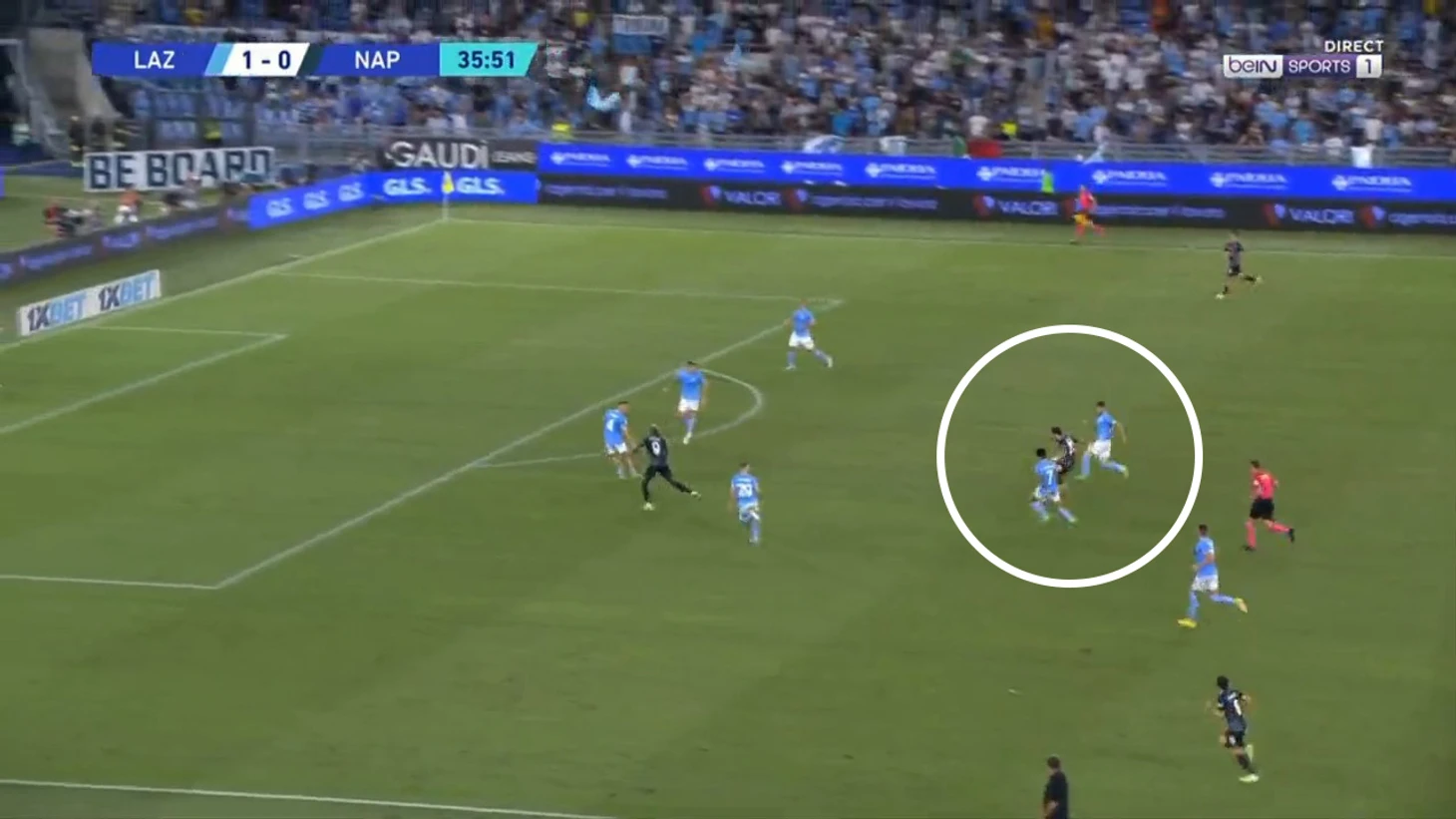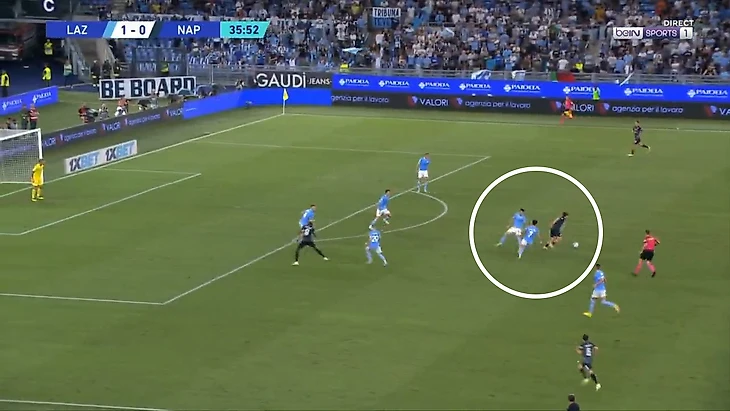 В середине первого тайма, когда римляне вели в счете, грузинский вингер получил мяч в 40 метрах от ворот, немного прошел вперед, а потом оказался зажат между двумя защитниками.