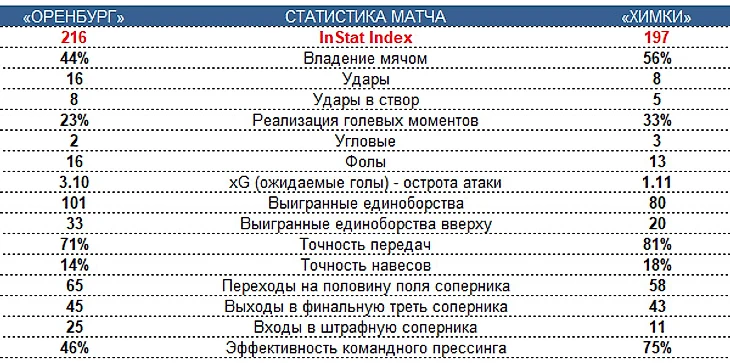 Счёт матча в соответствии с xG (ожидаемыми голами) – 4:1 в пользу «Оренбурга». Лучший игрок матча по версии эксперта канала Матч-Премьер – Джимми Марин. Лучшие игроки матча по версии InStat Index – Джимми Марин (257), Владимир Сычевой (250), Сесар Флорентин (246).