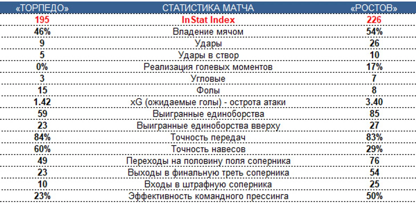 Счёт матча в соответствии с xG (ожидаемыми голами) – 4:2 в пользу «Ростова». Лучший игрок матча по версии эксперта канала Матч-Премьер – Давид Караев. Лучшие игроки матча по версии InStat Index – Максим Осипенко (262), Николай Комличенко (249), Даниил Уткин (246).