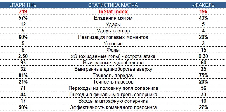 Счёт матча в соответствии с xG (ожидаемыми голами) – 3:0 в пользу «Пари НН». Лучший игрок матча по версии эксперта канала Матч-Премьер – Николай Калиннский. Лучшие игроки матча по версии InStat Index – Милсон (257), Лукас Масоэро (251), Евгений Морозов (248).