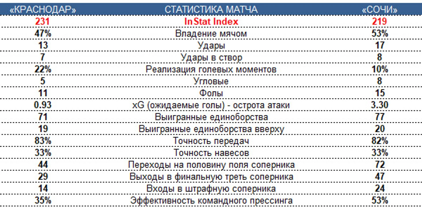 Счёт матча в соответствии с xG (ожидаемыми голами) – 4:1 в пользу «Сочи». Лучший игрок матча по версии эксперта канала Матч-Премьер – Олакунле Олусегун. Лучшие игроки матча по версии InStat Index – Олакунле Олусегун (268), Эдуард Сперцян (254), Кайо и Артём Макарчук (по 256).