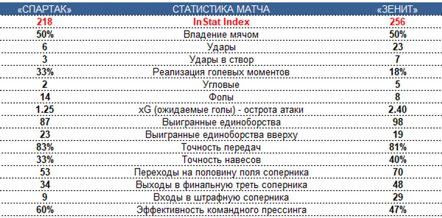 Счёт матча в соответствии с xG (ожидаемыми голами) – 3:1 в пользу «Зенита». Лучший игрок матча по версии эксперта канала Матч-Премьер – Андрей Мостовой. Лучшие игроки матча по версии InStat Index – Андрей Мостовой (300), Вендел (290), Деян Ловрен и Малком (по 288).
