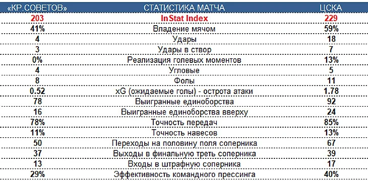 Счёт матча в соответствии с xG (ожидаемыми голами) – 2:0 в пользу ЦСКА. Лучший игрок матча по версии эксперта канала Матч-Премьер – Бактиёр Зайнутдинов. Лучшие игроки матча по версии InStat Index – Игорь Дивеев (269), Бактиёр Зайнутдинов (252), Иван Ломаев (249).