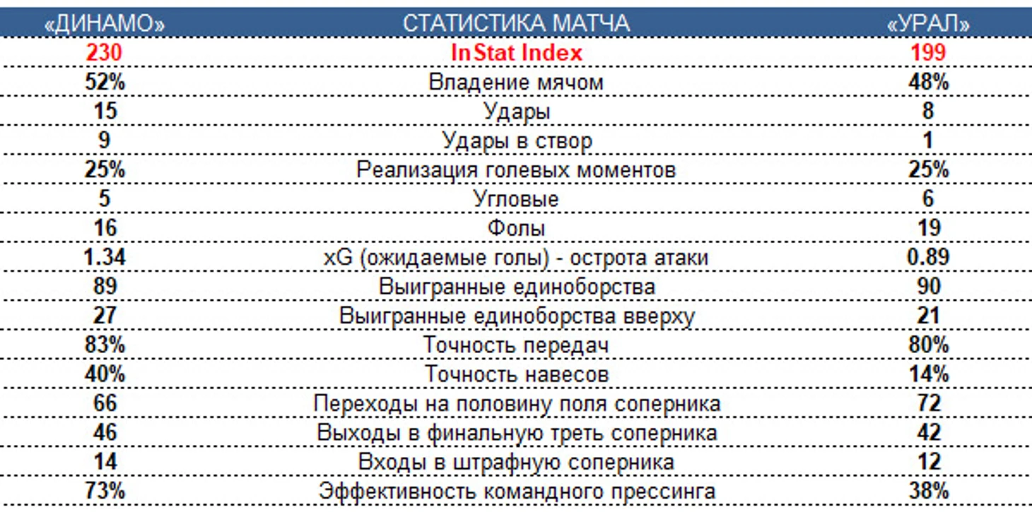 🕮 Факты: ◉ Динамовцы не потерпели ни одного поражения в стартовых восьми турах нынешнего сезона (четыре победы, четыре ничьи). Последний раз им удавалось подобное в сезоне-1996. ◉ «Динамо» в этом чемпионате России по нечетным турам играет вничью, по четным – выигрывает. ◉ Константин Тюкавин воспользовался отсутствием Федора Смолова в составе и забил уже в третьем матче РПЛ подряд - это его рекордная результативная серия в чемпионате России. ◉ Денис Макаров забил потрясающий гол дальним ударом, прервав свою 18-матчевую сухую серию в РПЛ - его последний гол был забит еще в декабре прошлого года в ворота «Уфы». ◉ Екатеринбуржец Эрик Бикфалви забил свой первый гол в новом сезоне РПЛ и 13-й гол головой в чемпионате России. С момента дебюта Бикфалви в РПЛ в 2016 году только Сердар Азмун и Артем Дзюба забили больше голов головой в чемпионате России. Первый – 18, второй – 16. ◉ В пяти последних матчах «Динамо» и «Урала» на поле «Динамо» было забито 18 мячей. ◉ «Урал» не побеждает в РПЛ восемь матчей. ◉ «Урал» набрал лишь одно очко после восьми стартовых туров. Это повторение худшего старта екатеринбуржцев в чемпионате России: также одно очко после восьми туров было у них в сезоне-2014/15. Тогда, к слову, екатеринбуржцы чудом остались в Премьер-Лиге. ◉ «Урал» не выигрывает в гостях отдельно взятые вторые таймы уже 19 матчей подряд.