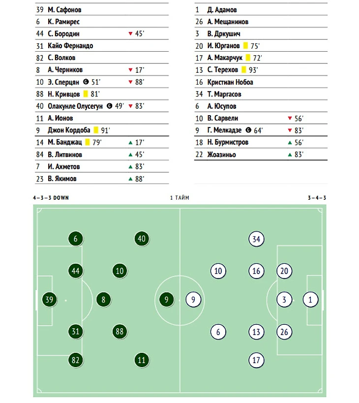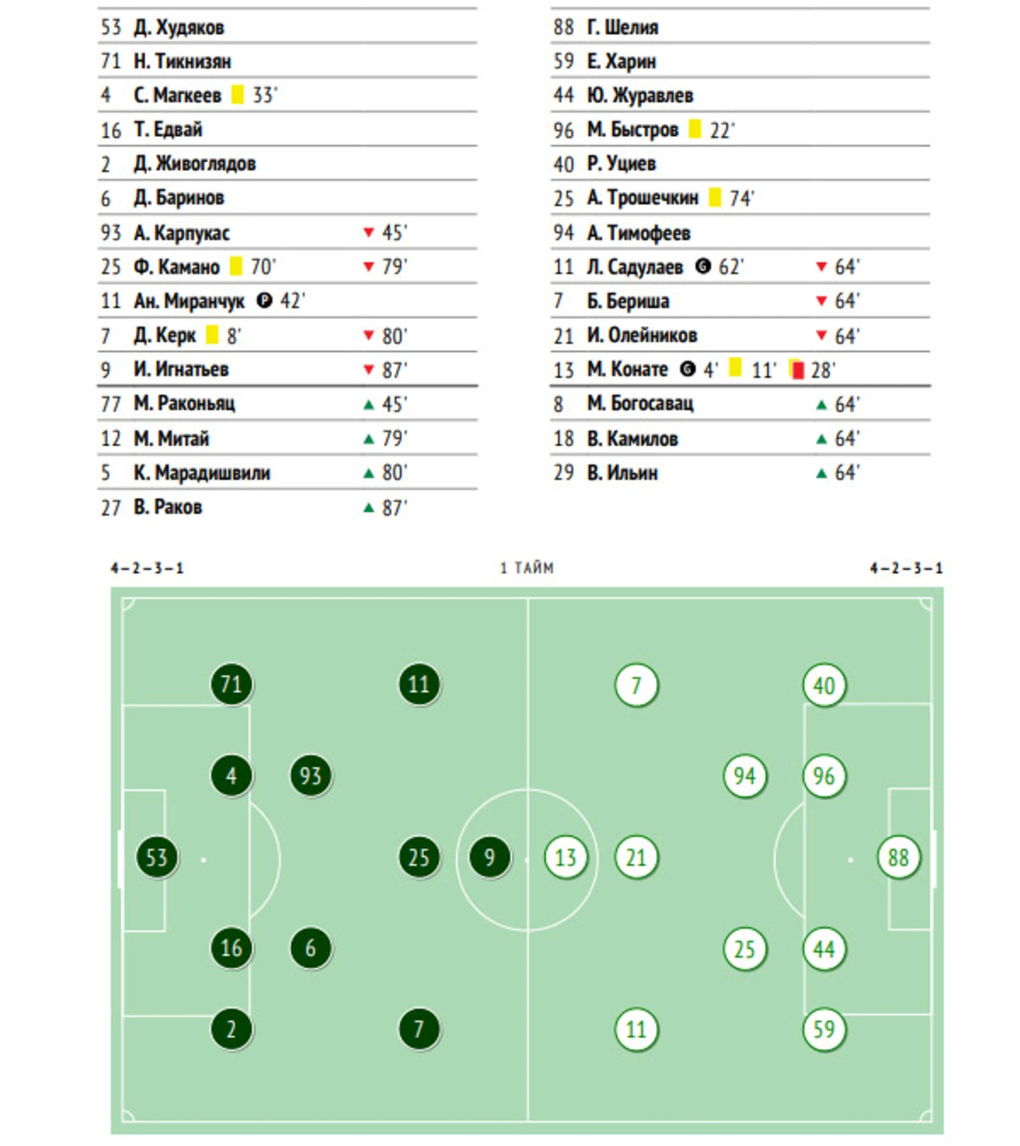 📕 Судейство На 8-й минуте арбитр Сергей Иванов должен был показать желтую или даже красную карточку новому главному тренеру «Химок» Спартаку Гогниеву за задержку мяча и препятствию к возобновлению игры команды-соперницы. Мяч выкатился за боковую рядом с тренером химчан, тот схватил его в руки, опередив игрока «Оренбурга», а потом выбросил на поле. А еще на общем плане показалось, что оренбуржец Сычевой перед своим голом на 37-й минуте в центре поля у боковой линии, перехватывая мяч от Дениса Глушакова, сыграл рукой. В таком случае гол засчитывать было нельзя.