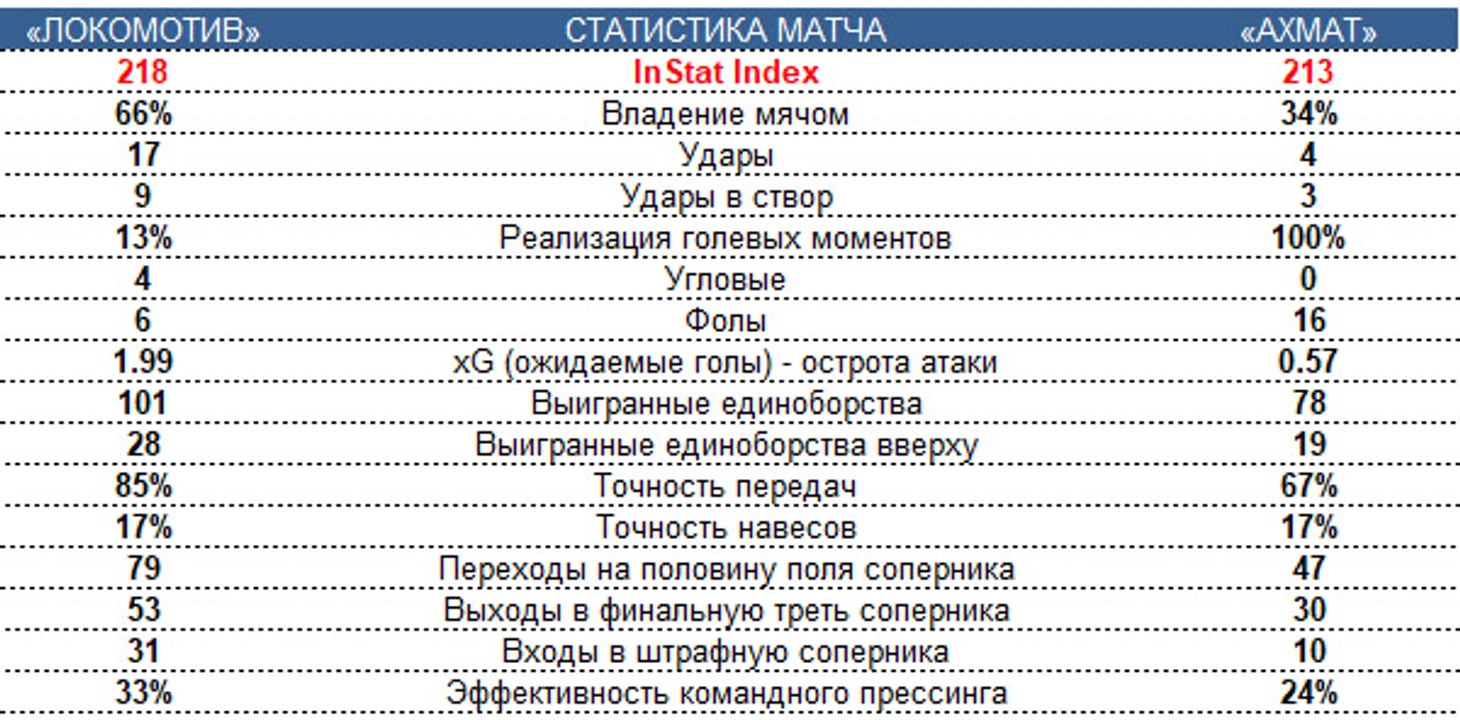 Счёт матча в соответствии с xG (ожидаемыми голами) – 2:0 в пользу «Локомотива». Лучший игрок матча по версии эксперта канала Матч-Премьер – Гиорги Шелия. Лучшие игроки матча по версии InStat Index – Антон Миранчук (270), Гиорги Шелия (261), Наир Тикнизян и Лечи Садулаев (по 259).