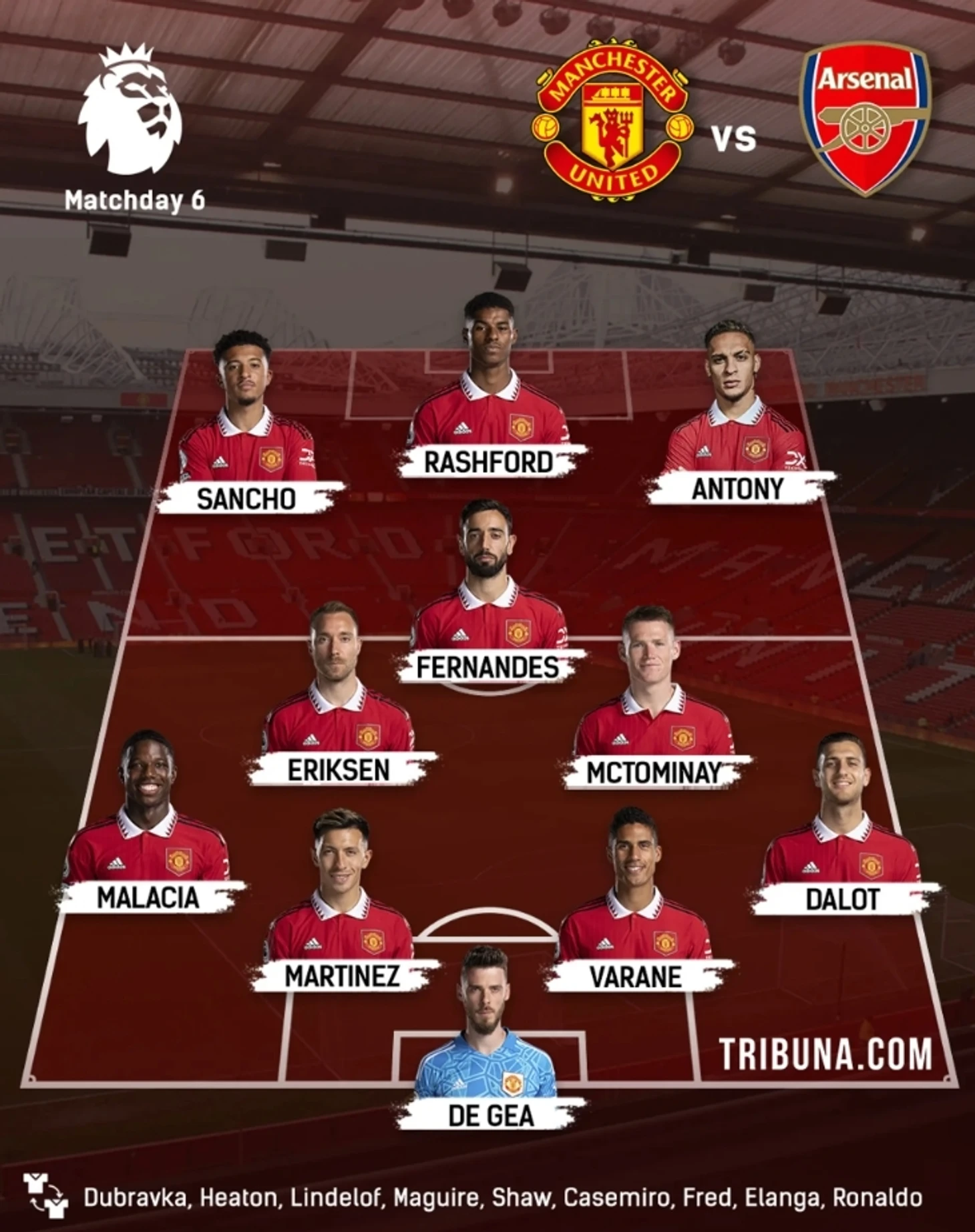 Стартовый состав: Де Хеа, Далот, Маласия, Мартинес, Варан, Мактомини, Эриксен, Фернандеш, Антони, Санчо, Рэшфорд.