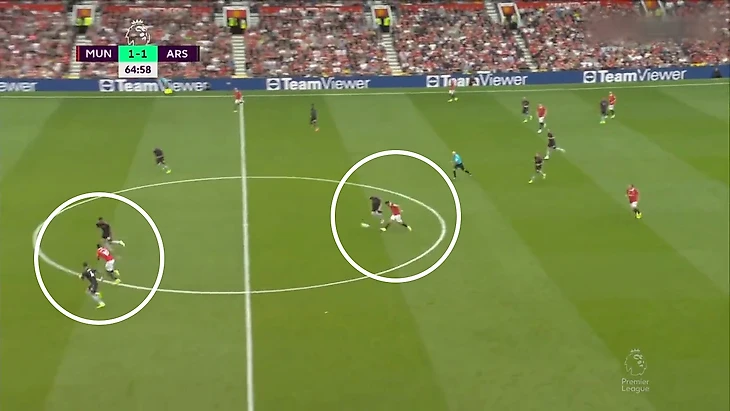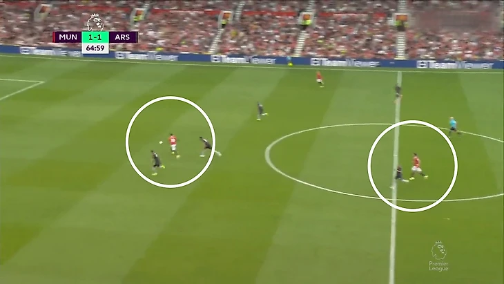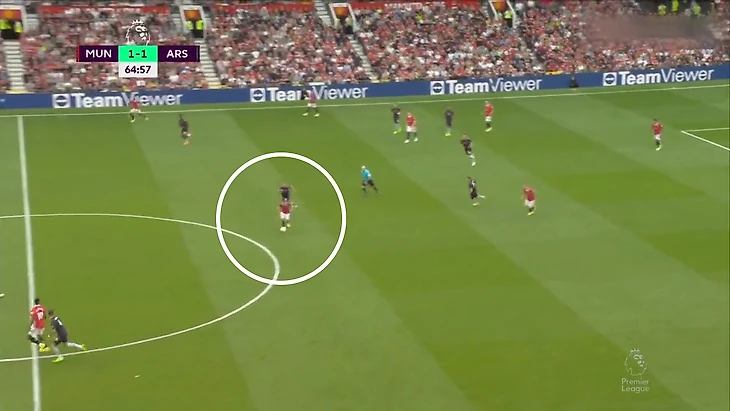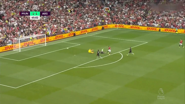 «Арсенал» больше 10 секунд катал мяч по половине поля «Юнайтед», но в итоге все закончилось неточным пасом и перехватом Далота. Португалец отпасовал Эриксену, а тот отдал мяч вперед – на Бруну Фернандеша.