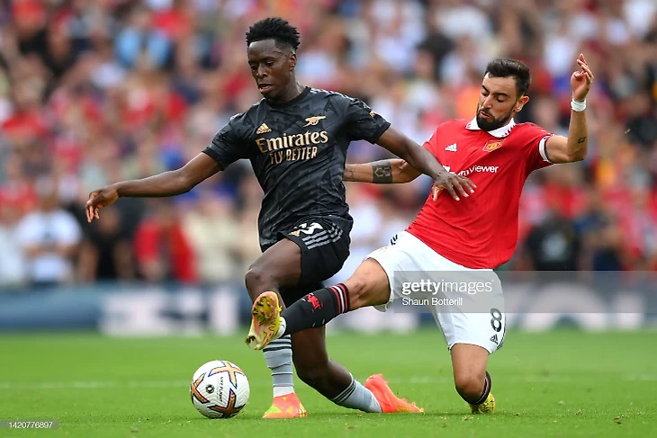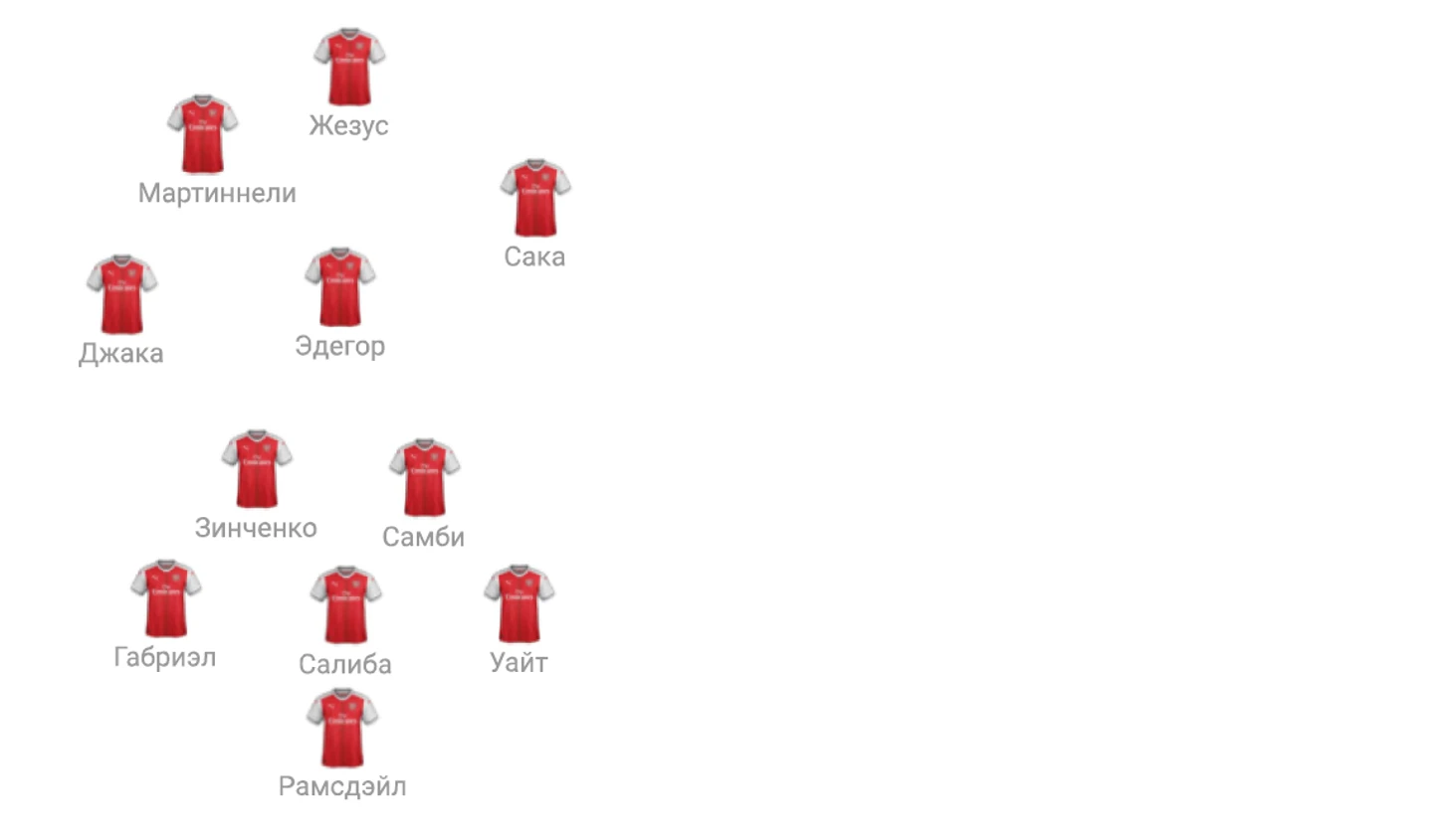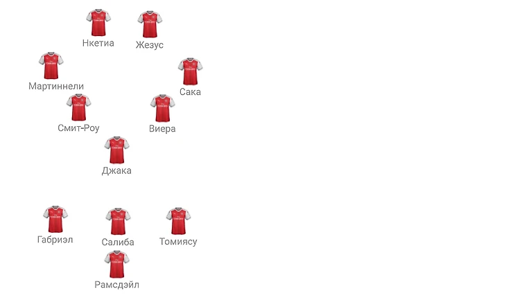 Впечатляет огненная форма Салиба, из-за которой Уайт похоже лишился своей родной позиции и вынужден начинать на фланге справа вместо Томиясу. Визуально Томиясу дает больший объем впереди и развязывает ноги Сака, который при атаке вынужден оглядываться назад, так как Артета использует гибридную схему: