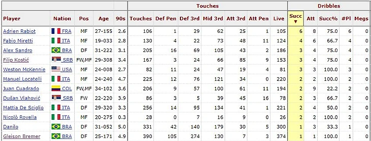 Количество дриблинга у игроков Ювентуса ярко резонирует на фоне французов и подчеркивает особенности туринцев. Лучший показатель у Адриена Рабьо. Он хорош на скорости, ему нельзя давать пространство, ибо он с легкостью проскакивает оппонентов, если нет подстраховки. К тому же Адриен очень старательно бережет и укрывает мяч. На мой взгляд, его в обращении с мячом определяют 2 слова «надёжность» и «аккуратность». Возможно, он делает это нерегулярно (соперники не позволяют), но стабильно.