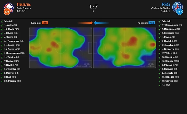 Возьмём последний матч с Нантом, который Париж начал с тройкой атаки Месси – Мбаппе – Санабрия. Тепловая карта подсказывает: Месси активнее всего действовал в центре из глубины, Санабрия сваливался направо, а Мбаппе атаковал штрафную слева. Но в том же матче и Месси совершал рывки между защитниками, реагируя на прострелы с фланга. В общем и целом, можно сказать, что у нападающих ПСЖ нет жёстких ограничений и им предоставлена определенная свобода.