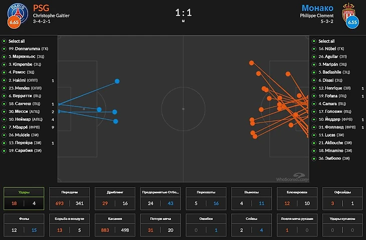 Успех Монако в том матче предопределила не только оборона, но и быстрый выход из обороны в атаку: после потери Месси в центре, Головин подобрал мяч и быстро отправил его на ход Фолланду. Немец не сплоховал и точным ударом в дальний угол открыл счёт в матче – 1:1. Тут сложно обвинить защиту Парижа – нападающий Монако быстро среагировал и ворвался в коридор, попутно пробежав ещё метров 20 практически без сопротивления. В чём причина? Высокая линия обороны, которая даёт сбой при таких жёстких потерях во время «билд-апа».