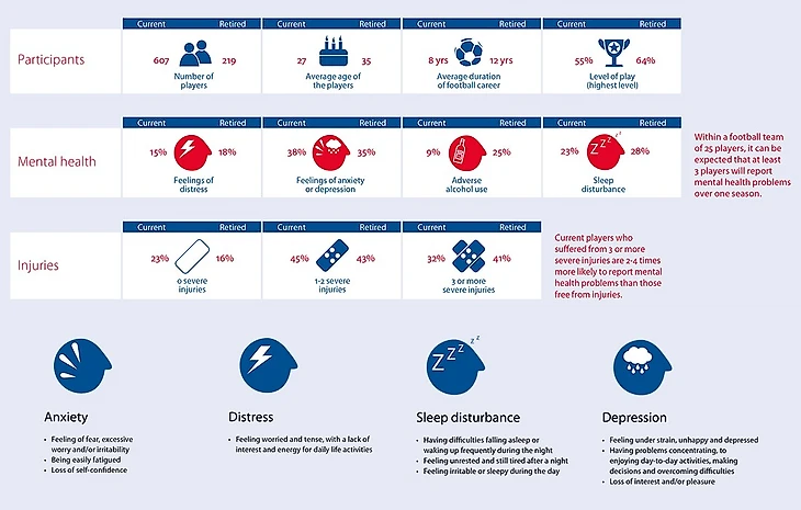 3. По данным FIFPro проявления тревоги и депрессии есть у 30% среди действующих игроков и 40% - среди бывших футболистов. Как следствие, проблемы с алкоголем - у 9 и 25% соответственно. Бессонница - у примерно четверти спортсменов. Особая зона риска - футболисты, имевшие несколько травм.