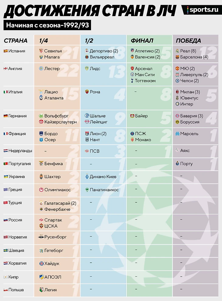 • Команды из 7 стран выигрывали ЛЧ. Расширение этого списка в ближайшее время крайне маловероятно. А вот к 13 клубам-победителям скоро наверняка добавятся как минимум «ПСЖ» и «Ман Сити».