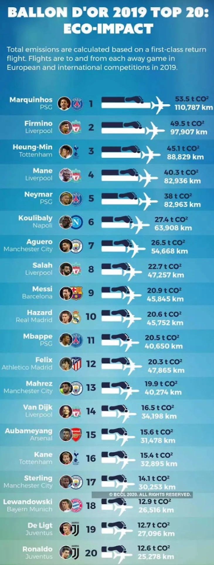 Ученый Эндрю Уэлфл из Центра Тиндалла по исследованию климатических изменений решил тогда выяснить, какую нагрузку на окружающую среду оказывают звезды футбола, которые постоянно находятся в перелетах между странами. Он подсчитал, сколько раз футболисты пользовались самолетами в 2019 году, и на основе этих данных определил количество углекислого газа, который выделился в атмосферу во время полета. Рейтинг составлен из игроков, которые попали в топ-30 голосования за «Золотой мяч»-2019.