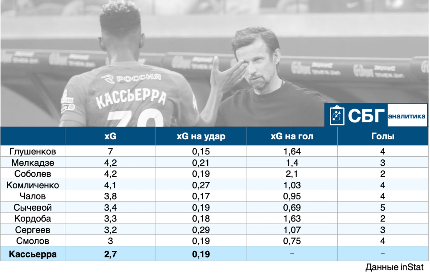 В то же самое время тренерский штаб ищет способ максимально эффективно использовать Кассьерру. Например, из 14 попыток Кассьерры забить (к матчу с "Торпедо") 7 произошли в формате выбегания на ближнюю штангу. Это не естественное действие для форварда. В "Белененсеше", в "Сочи" он сильно реже атаковал ближнюю штангу. Более того, он почти не забивал из зоны ближней штанги по ходу карьеры.