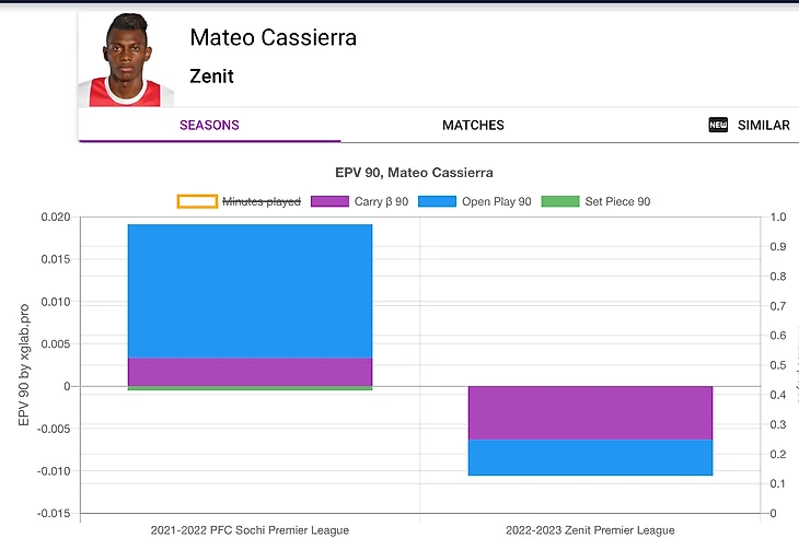 Вместе с тем, годом ранее Кассьерра участвовал в 0,88 xGChain (цепочка атаки, закончившаяся ударом, в которой нападающий коснулся мяча). Сейчас всего 0,67 xGChain. Данные Understat. Матео реже участвует в билдапе (сказывается падение количество забросов). Ему тоже очень нужно перестроиться.