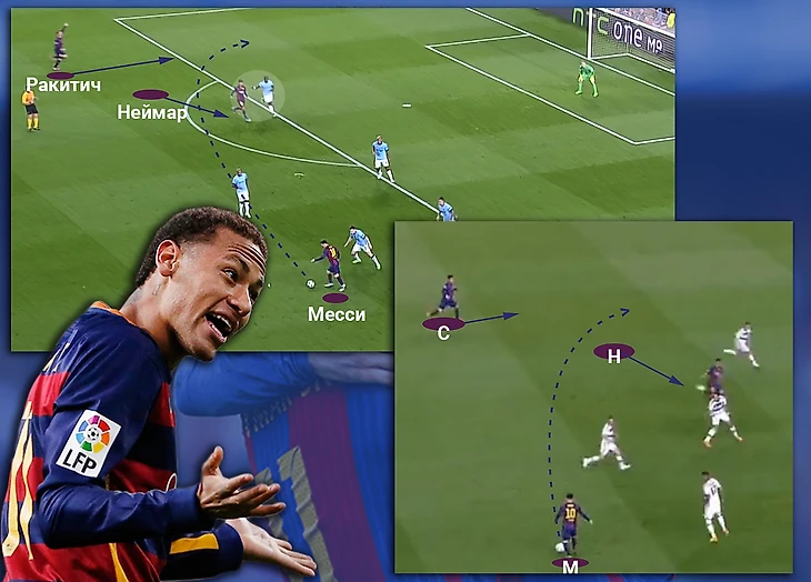 Луис Энрике пытался раскрывать сильные стороны Неймара и работать на команду. Его рывки в позиционке или в контратаке не только предлагали вариант отдать пас на самого бразильца, но и часто освобождали парнеров. На верхней картинке изолированный Неймаром Ракитич забьет гол после передачи Месси. На нижней - бразилец создает пространство для Суареза в контратаке.