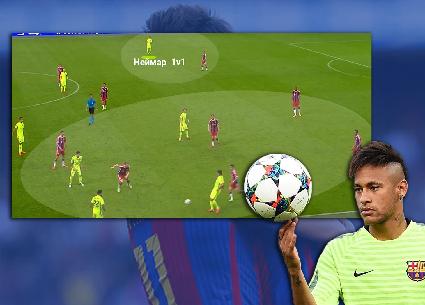 Что касается сильных качеств Неймара, то сине-гранатовые ( на примере ниже - кислотные )) использовали его дриблинг на фланге. Суарез, Месси, Ракитич и Алвес перегружали фланг, а на противоположном Неймар оставался в ситуации 1v1 против Рафиньи.