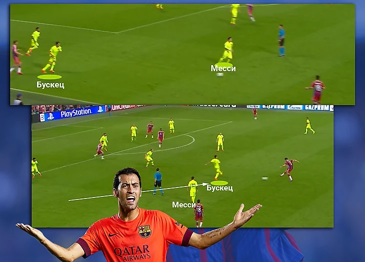 В обороне за него дорабатывали не только Суарез и Неймар, но и Серхио Бускетс. Против Баварии ему приходилось пробегать несколько челноков) Яркий пример на скришотах ниже.