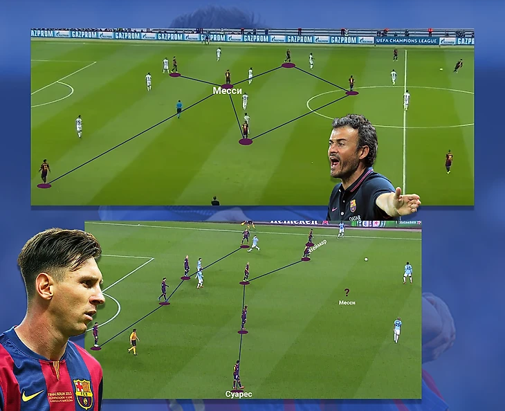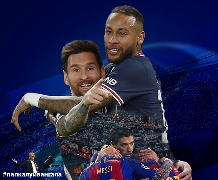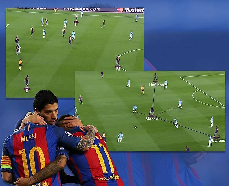 #папкалуивангала 2015 год. Барселона. У руля каталонского клуба находится Луис Энрике. В его распоряжении, возможно, лучшее трио нападения за всё время существования футбола - Месси, Суарез, Неймар. Дополнительные материалы по тексту в моем телеграм-канале Париж. Наши дни. Под руководством французского тренера Кристофа Галтье всё те же Месси и Неймар, но вместо уругвайского нападающего суперзведа, и ,возможно, главный талант поколения - Килиан Мбаппе. Праймовая Барселона Луиса Энрике выигрывает все возможные титулы, а главное забирает Лигу Чемпионов. Почему главное? Потому что здесь мы постараемся разобраться в том, что тренер ПСЖ должен подсмотреть у испанского коуча, чтобы взять заветный ушастый кубок, ведь все внутренние титулы для парижского клуба были подвластны и даже не раз. Трансферы всех звезд нацелены именно на ЛЧ. Галтье осталось понять, как выстроить вокруг них систему для добычи титулов. Давайте разбираться! Начнем, пожалуй, с командной структуры. Схема Барсы в нападении выглядела как 4-3-3 или 4-1-4-1, в защите 4-5-1 или 4-4-2. Хочу обратить ваше внимание на позиции атакующего трио, центральный нападающий Луис Суарез не образует чуть ли не пятерку в линии защиты. На скриншоте он не дает Ман Сити перегрузить линию или изолировать кого-либо на фланге. Неймар тоже дорабатывает в обороне до конца, освобожден от оборонительных задач только Лионель Месси!