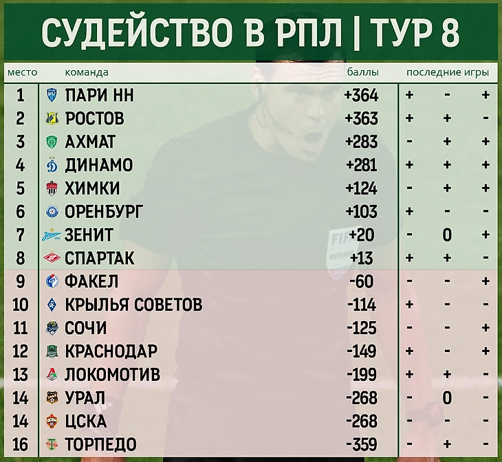 Как и бывает после туров, когда было допущено очень много судейских ошибок, таблица команд по лояльности к ним арбитров сильно изменилась. Почти на самый вверх прорвался "Ростов", которому в последних двух играх очень помогали. Теперь можно сказать, что ростовчанам с динамовцами с судейством явно везет на старте сезона. "Химки" после ошибок в свою пользу получили ответку (хотя ее мало кто заметил), внизу главным пострадавшим стало разумеется московское "Торпедо". Как бы ни был плох главный аутсайдер чемпионата, на 1-2 очка больше он все же должен был набрать. "Уралу" с ЦСКА также достается немало, а вот "Локомотив" с "Краснодаром" потихоньку выходят наверх.