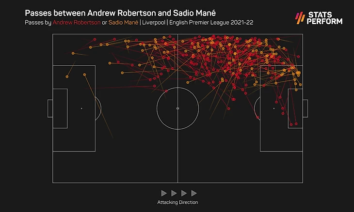 В этом сезоне они регулярно комбинируют, совершая 24,7 передачи друг другу за 90 минут. Это значительное увеличение по сравнению с 13,4 между Робертсоном и Мане в 2021/22 годах. Однако на эту цифру, вероятно, повлияло то, что во второй половине сезона роль игрока сборной Сенегала была заменена на центрального нападающего.