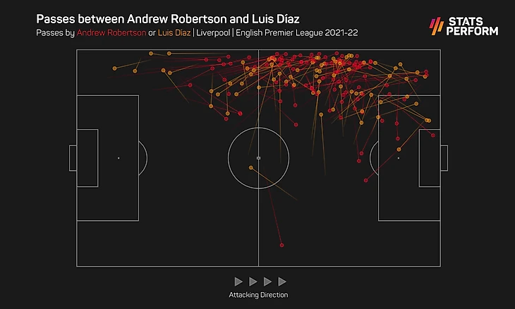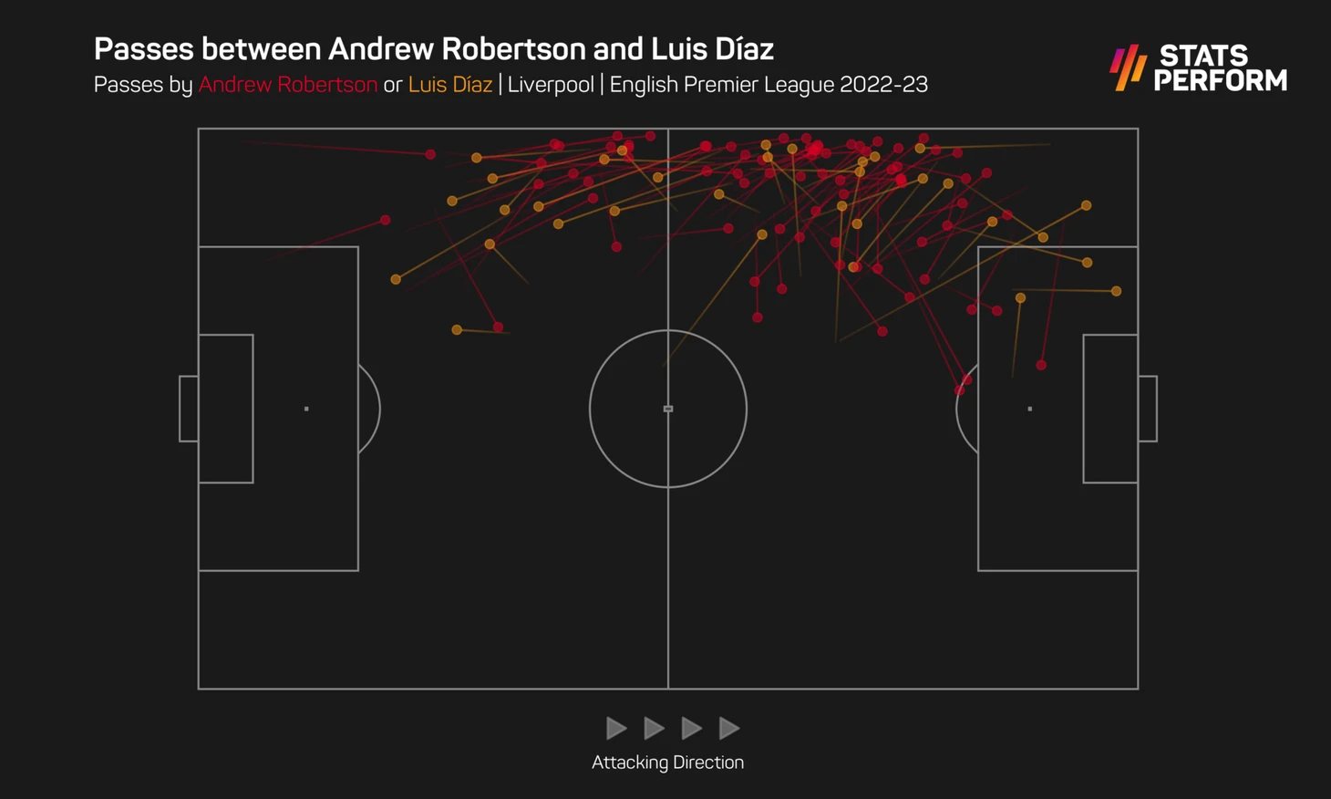 Когда мы смотрим на карты передач между Диасом и Робертсоном из этой кампании и последней, после подписания южноамериканца в зимнее трансферное окно, есть разница между тем, где эта пара, по-видимому, комбинирует.