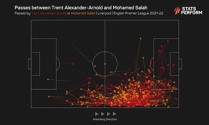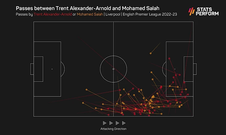 Александер-Арнолд и Салах за последние пять лет построили прекрасные отношения, но, по сравнению с прошлым сезоном, пара все реже находит друг друга. Пока что в 2022/23 годах они делают в среднем 16,4 передачи друг другу за 90 минут, по сравнению с 18,6.