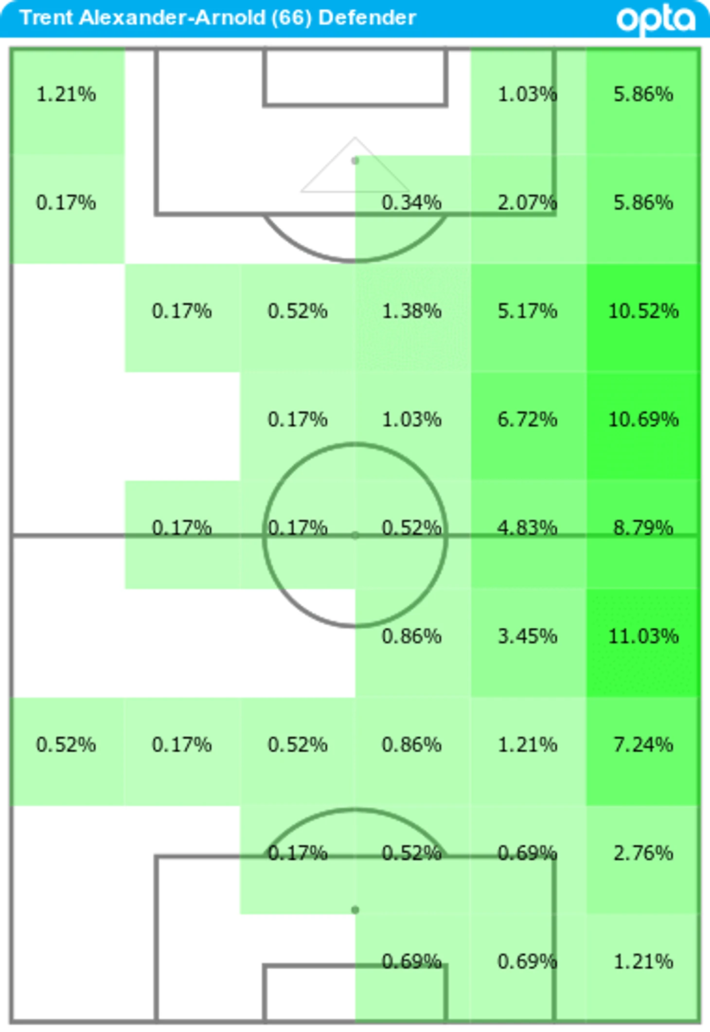 Это говорит о том, что Александер-Арнолд чаще оказывается на мяче в более атакующих зонах.