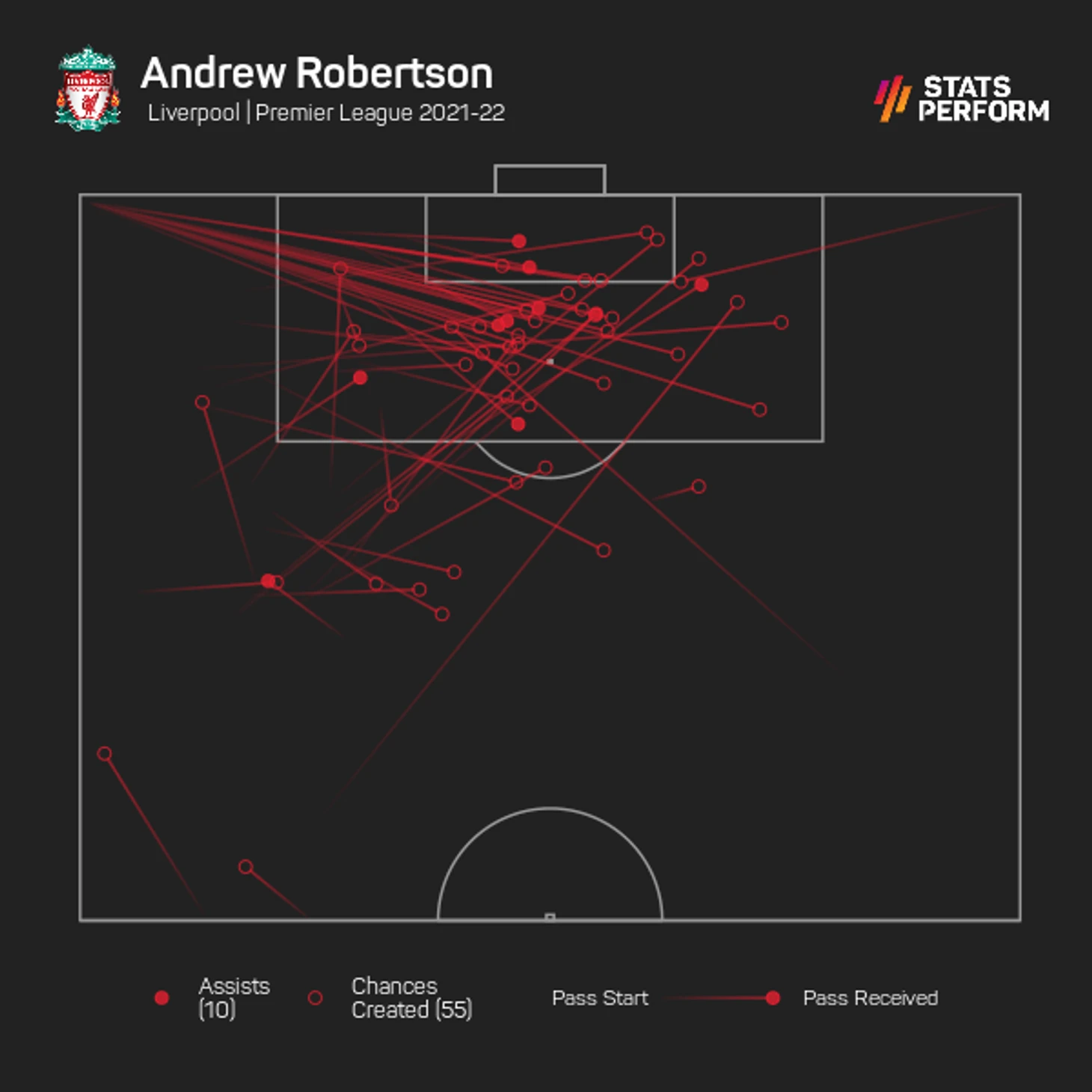 Как и в случае с Александер-Арнолдом, сложно делать решающие выводы после шести игр, но по сравнению с графиком 2021/22 годов, приведенным выше, в креативности Робертсона в этом сезоне не хватает разнообразия, хотя это соответствует показанной ранее сенсорной карте.