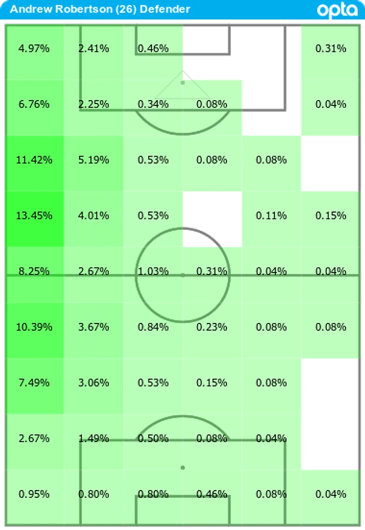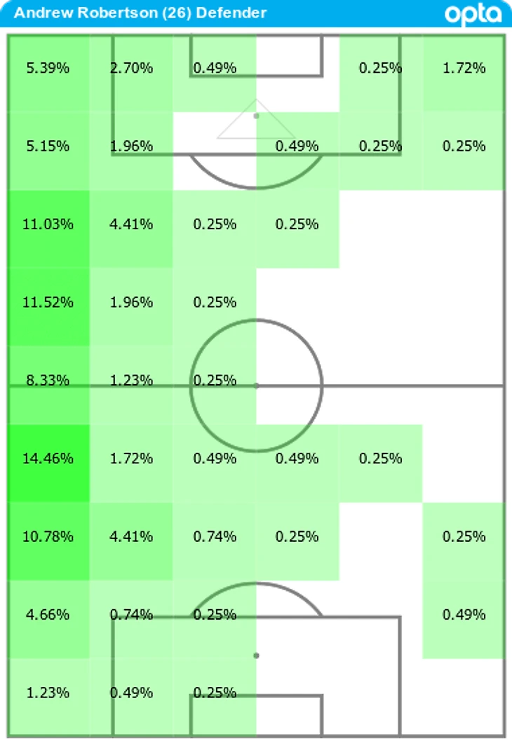 За 90 минут Робертсон отдает в общей сложности меньше передач, чем в прошлом сезоне (с 68,3 до 65,6), и он также не выполняет столько передач в финальной трети соперника (снижение с 16,9 до 14,5).