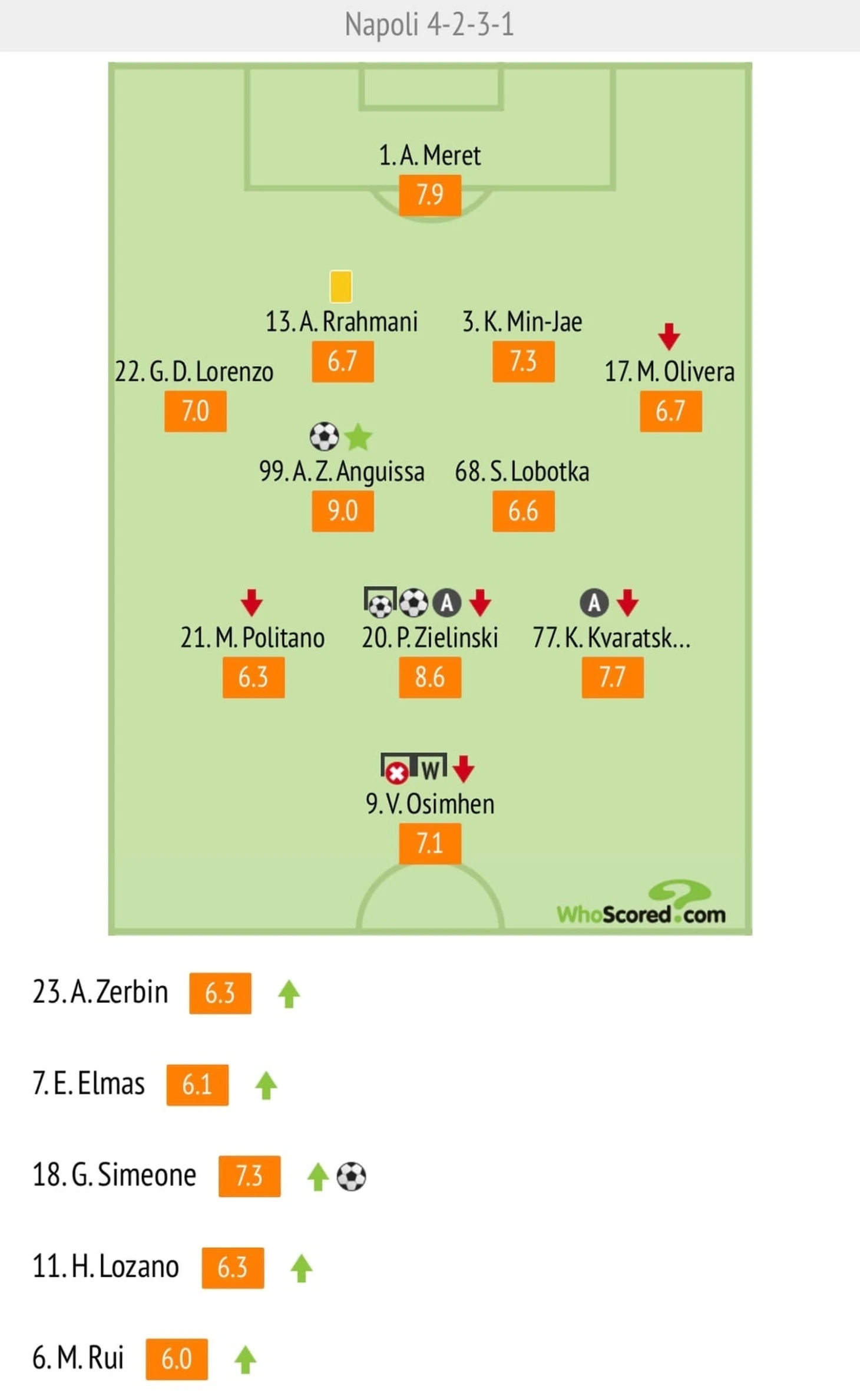 Мерет - Ди Лоренцо Ким Рахмани Оливейра (Руй 74') - Лоботка Ангисса Зелиньски (Элмас 74)' - Политано (Лосано 57') Кварацхелия (Зербин 57') Осимен (Симеоне 41')